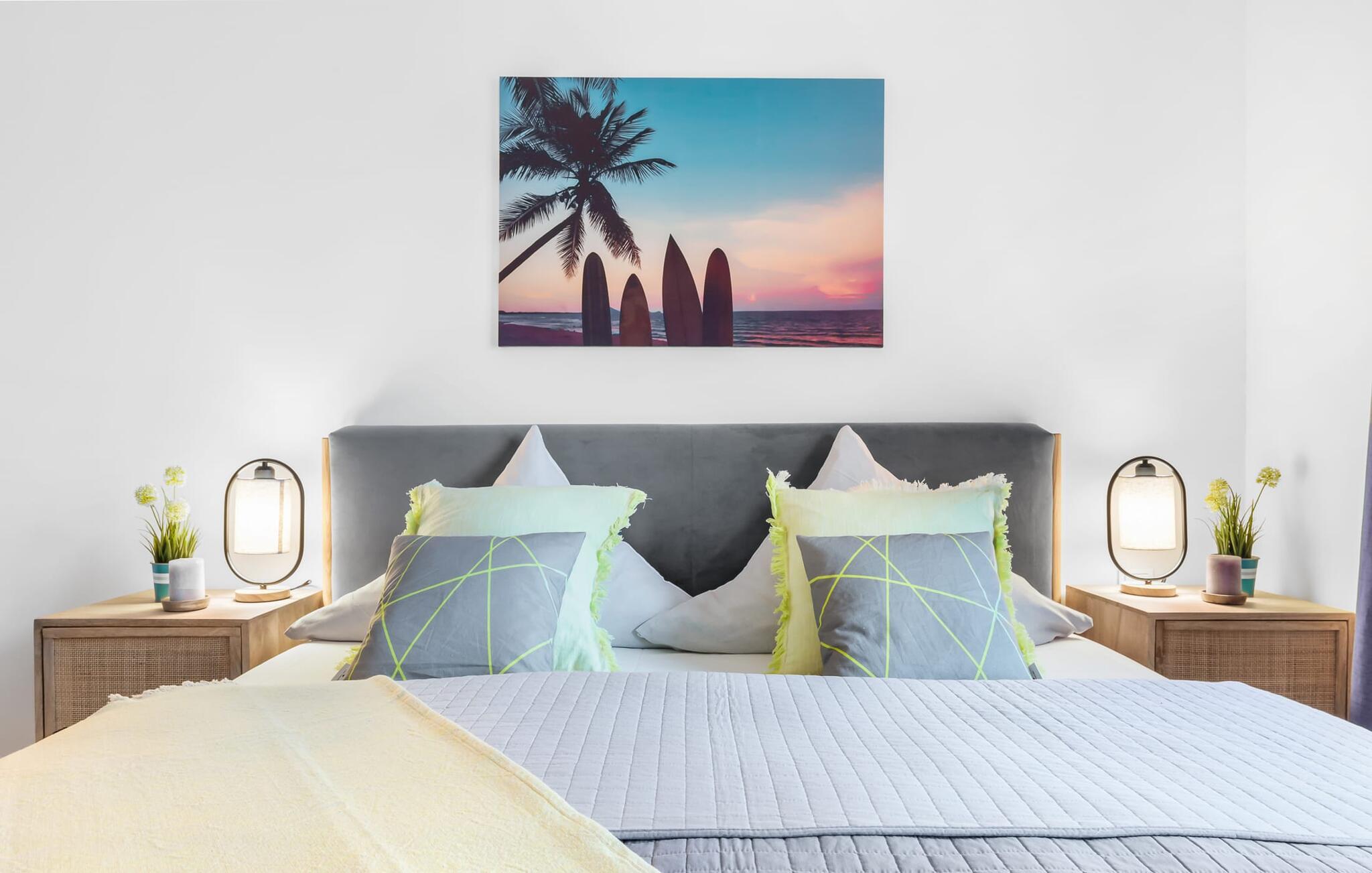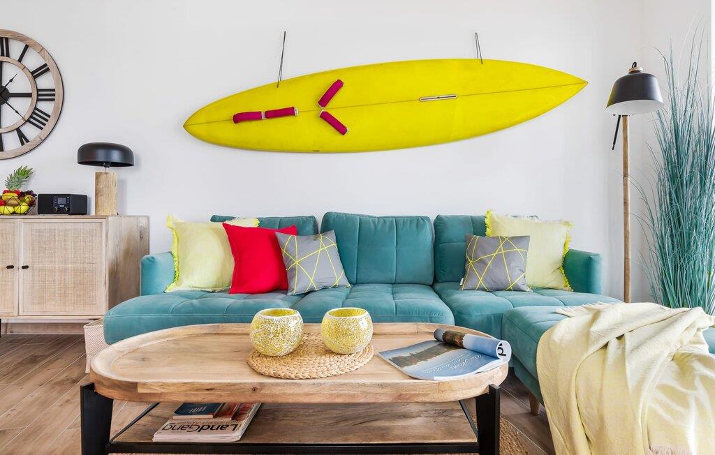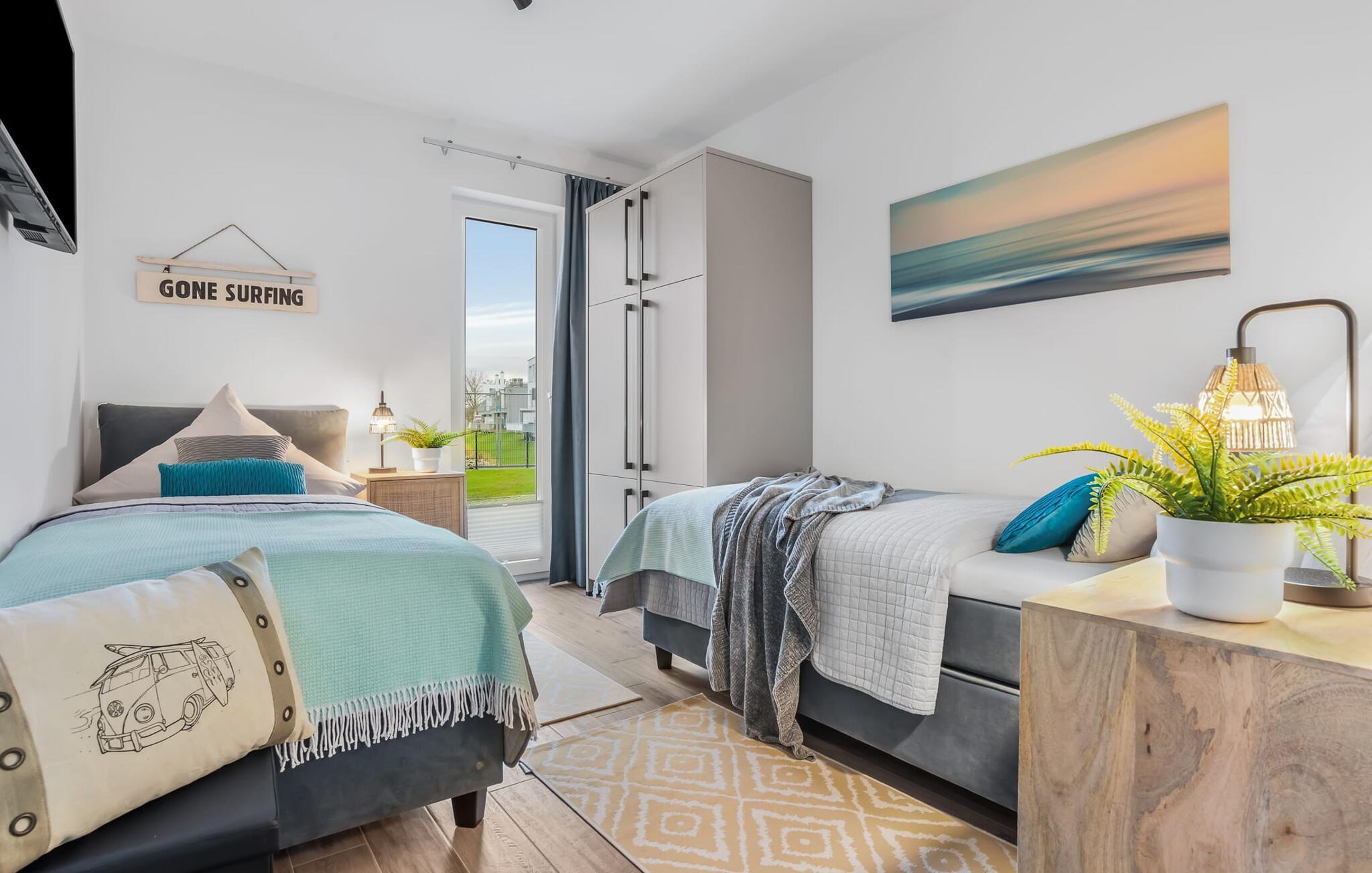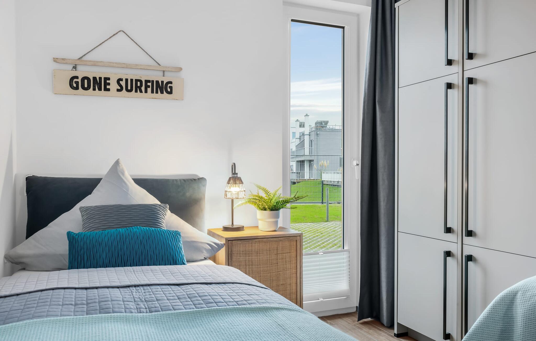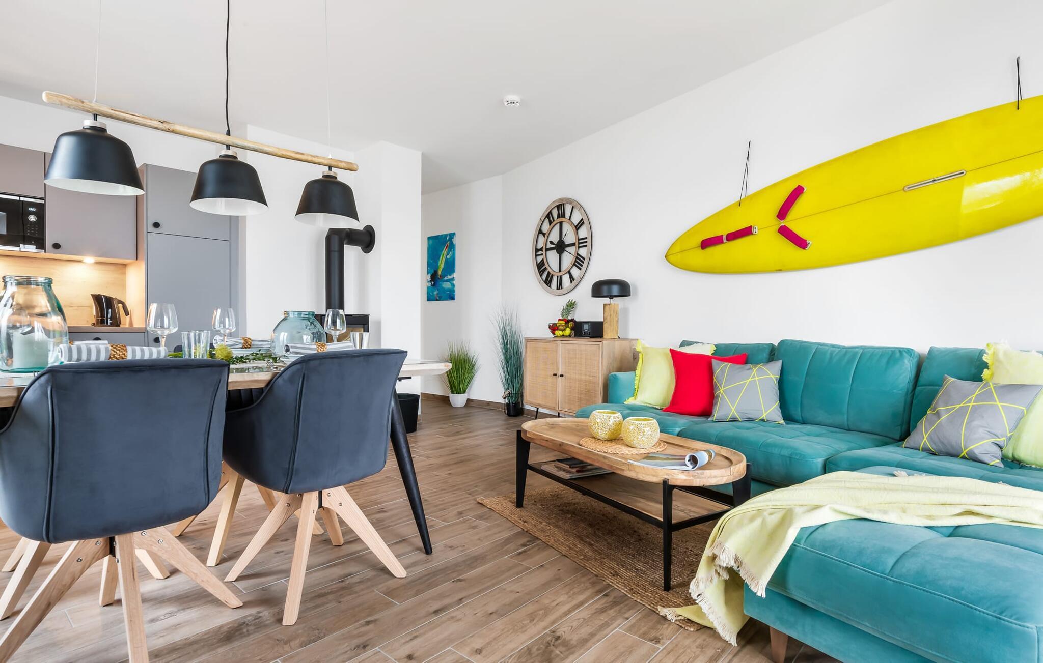 Im Wohnbereich dominiert die bequeme Wohnlandschaft mit Fernseher und Kaminofen, dem es gelingt, selbst Schmuddeltage in Kuscheltage zu verwandeln. Die Einrichtung der SURFERS LOUNGE ist nordisch gemütlich und wird mit frischen BoHo Akzenten unterstrichen.