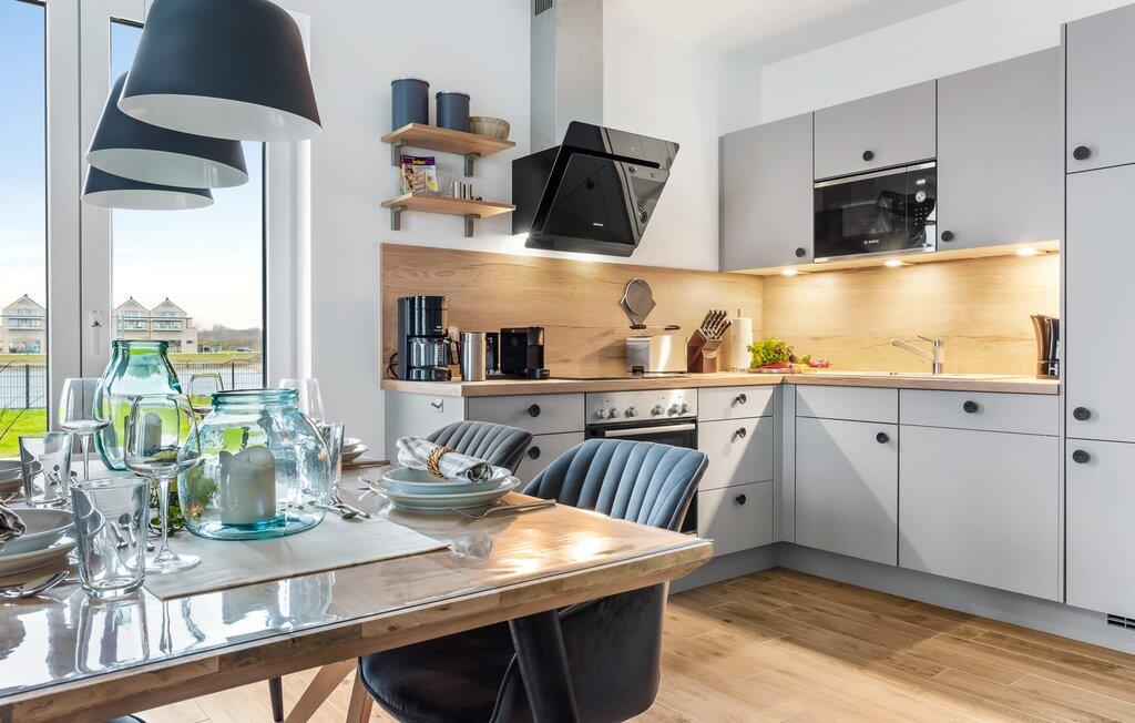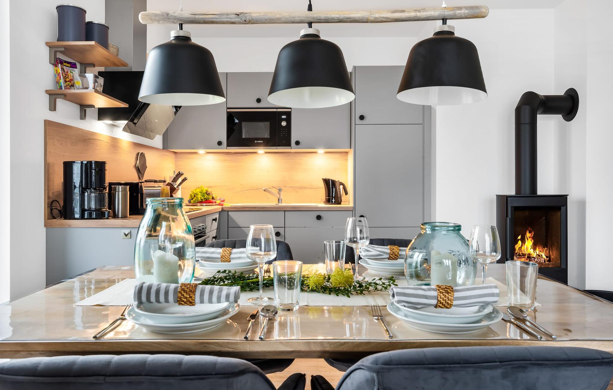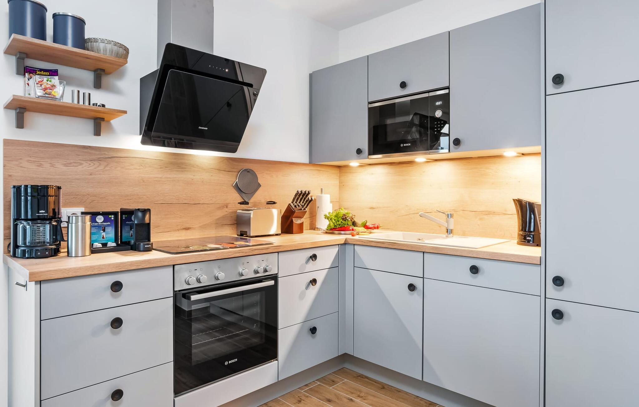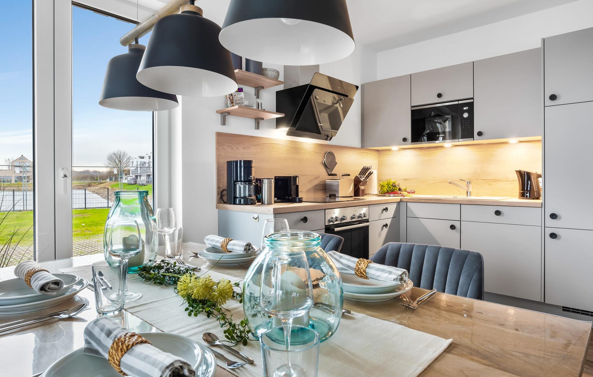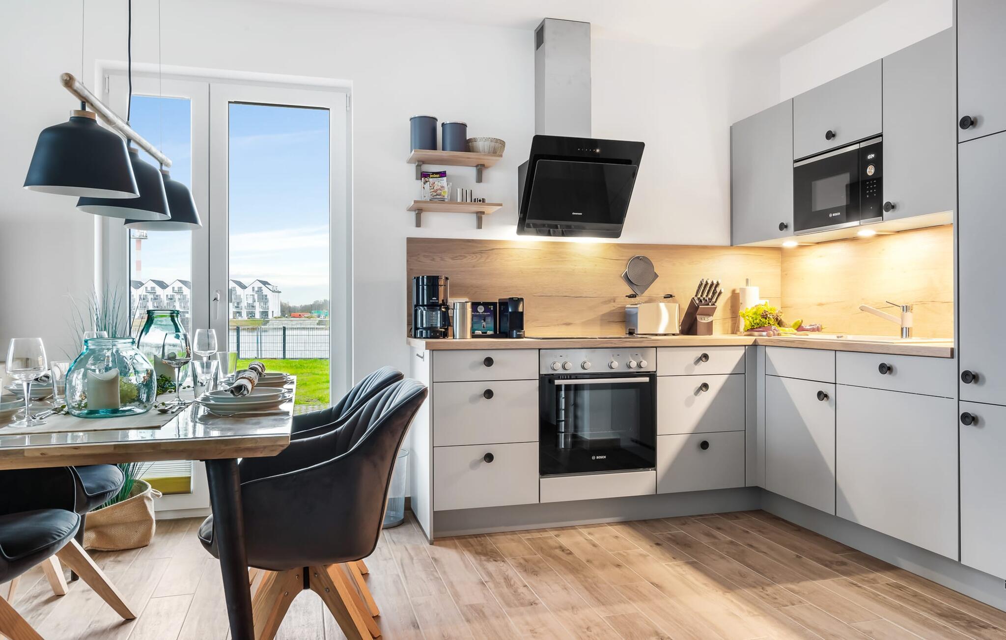 Die voll ausgestattete Küchenzeile lässt keine Wünsche offen und weckt die Lust gemeinsam Leckereien zuzubereiten, um sie dann gemeinsam zu genießen. Und der Hafenblick ist immer begleitend dabei.