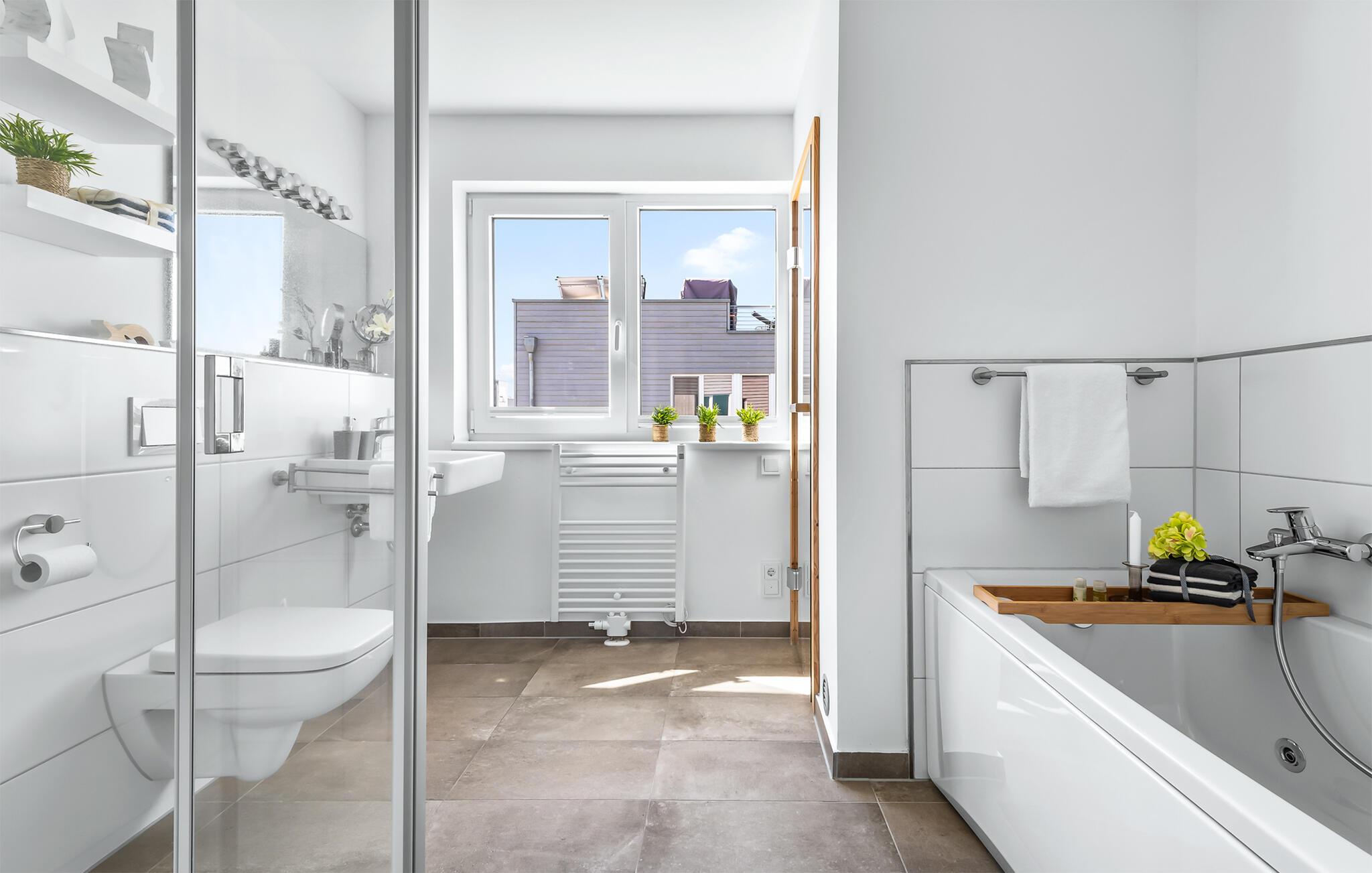 Ebenfalls auf dieser Ebene befindet sich das Badezimmer mit Hafenblick. Finnische Sauna mit Wasserblick und Whirlwanne lassen hier Spa-Herzen höher schlagen.