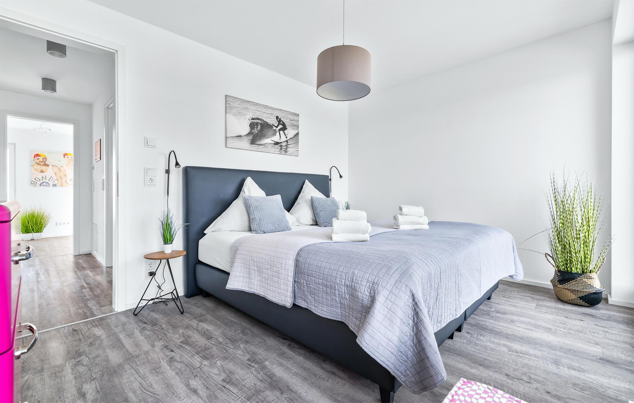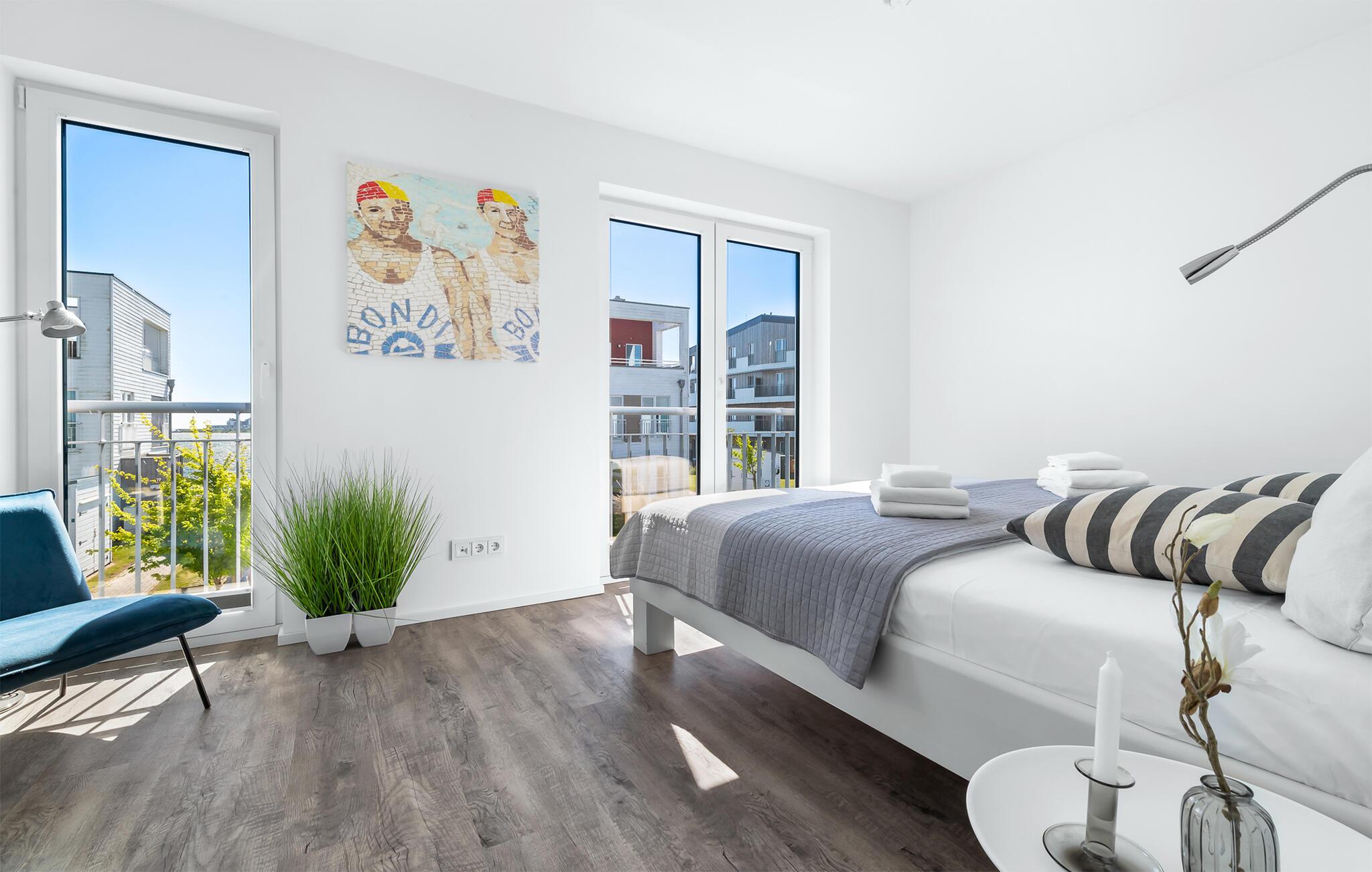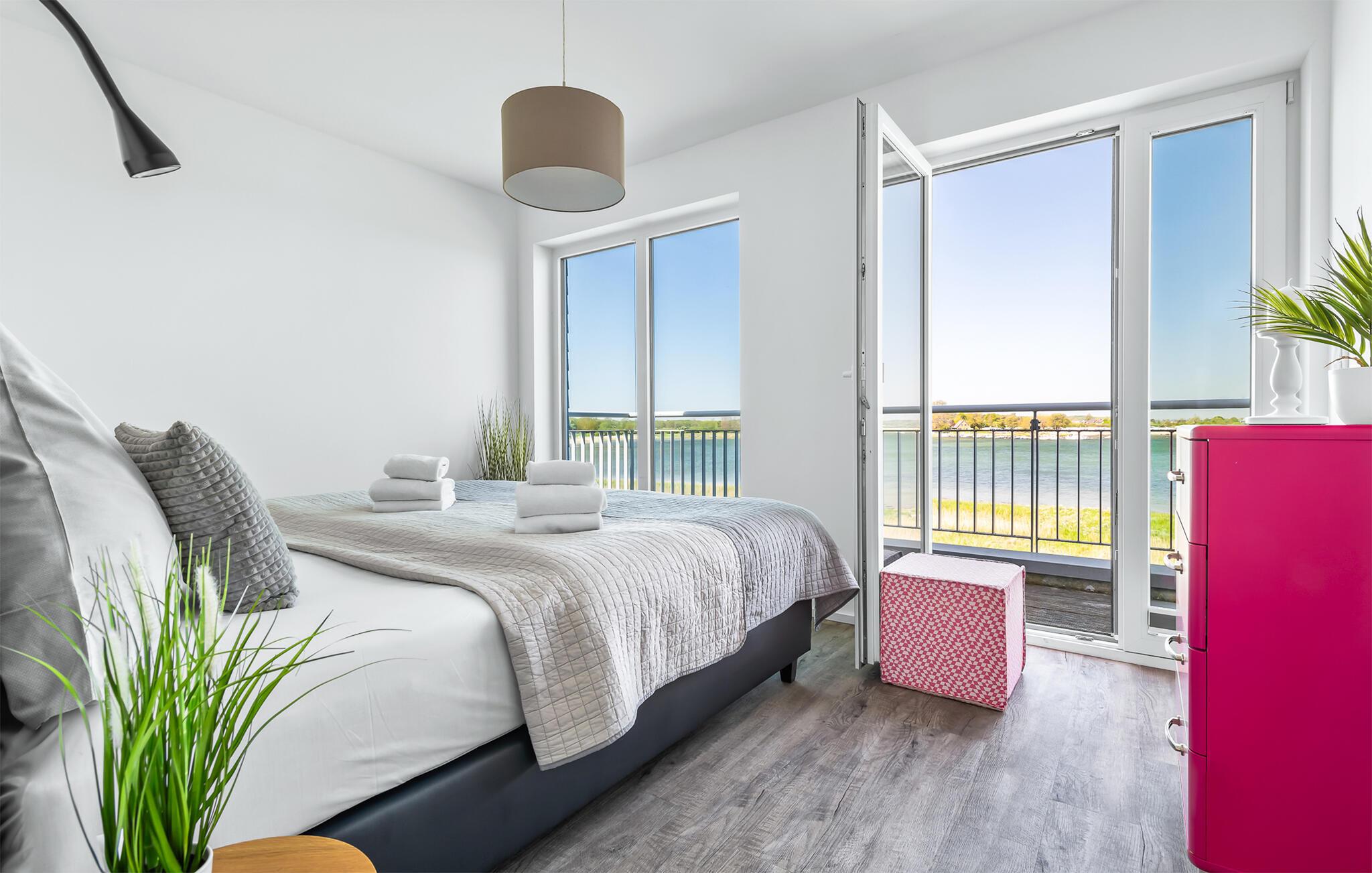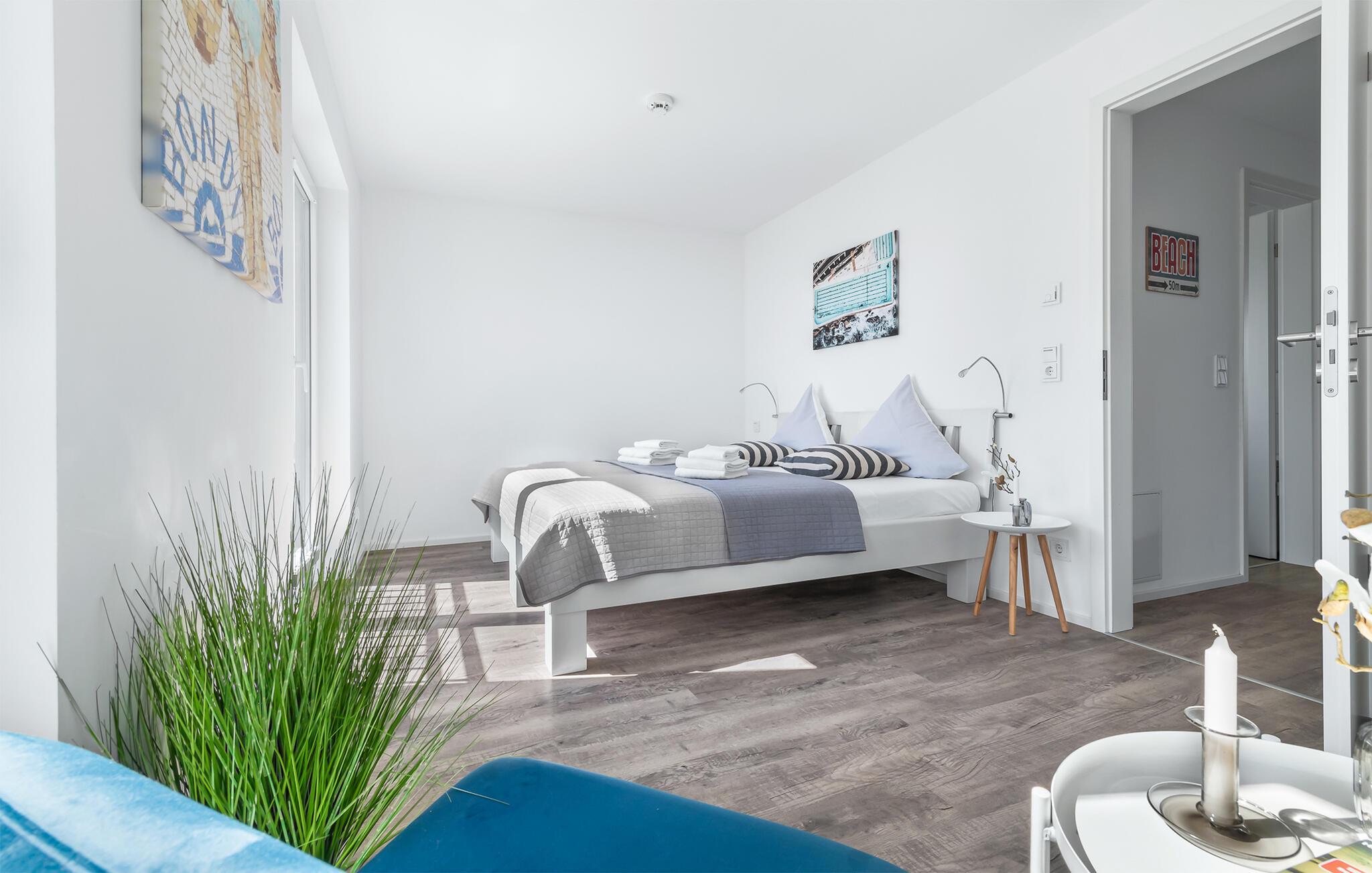 Der Ruhebereich des Ferienhauses befindet sich im ersten Obergeschoss. In zwei Schlafzimmern darf der Gast einschlafen und aufwachen bei Wasserblick. Das Hauptschlafzimmer ist zur Schlei ausgerichtet und mit einem Doppelbett ausgestattet. Bei einem morgendlichen Kaffee lassen sich auf der angrenzenden Terrasse Enten, Gänse und Austernfischer beim Aufwachen beobachten, während sich das Schilf vom Schleiufer seicht im Wind wiegt. Das zweite Schlafzimmer erlaubt den Blick auf die Marina und verfügt über zwei flexibel zusammenschiebbare Einzelbetten.