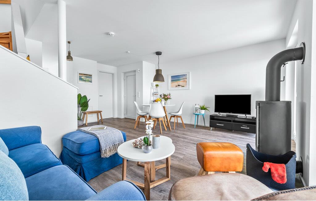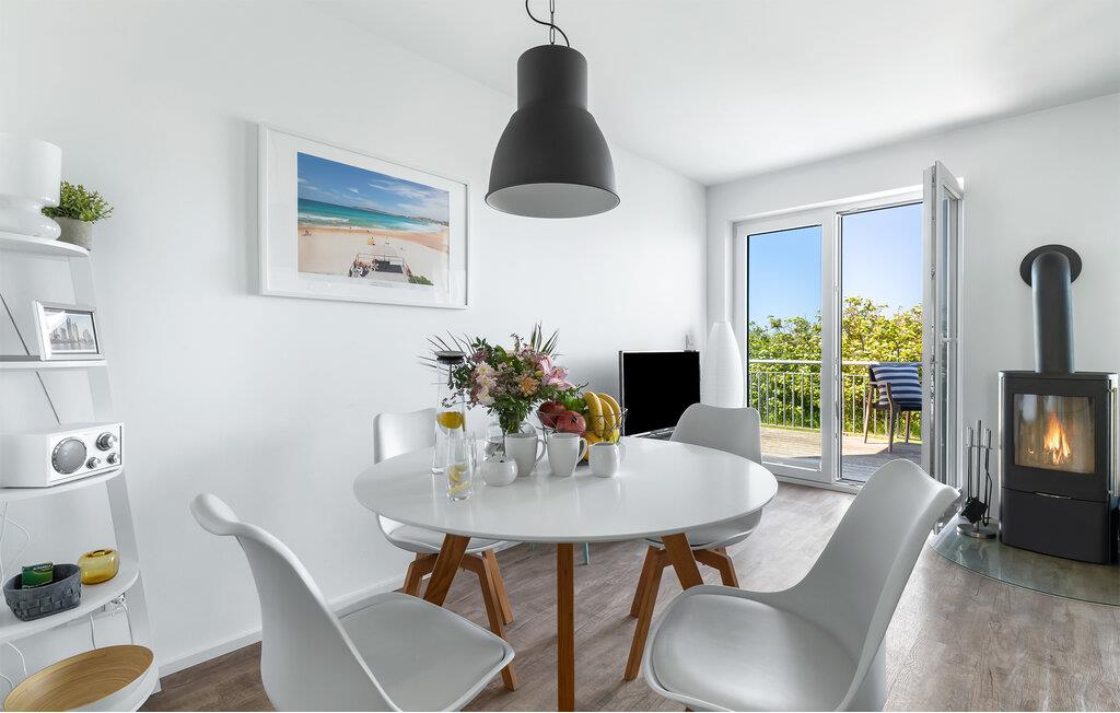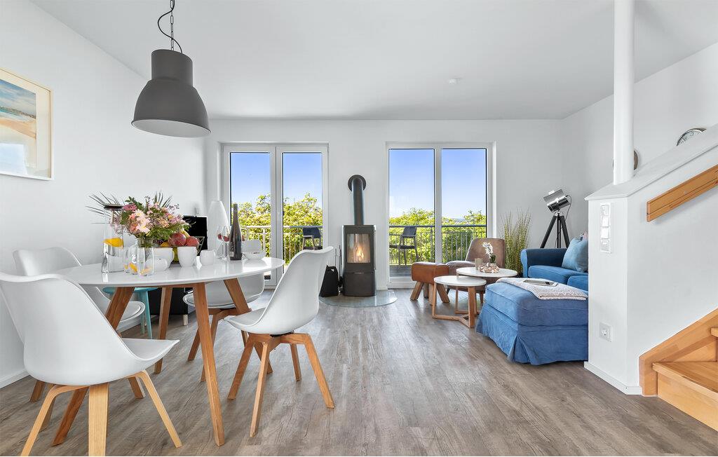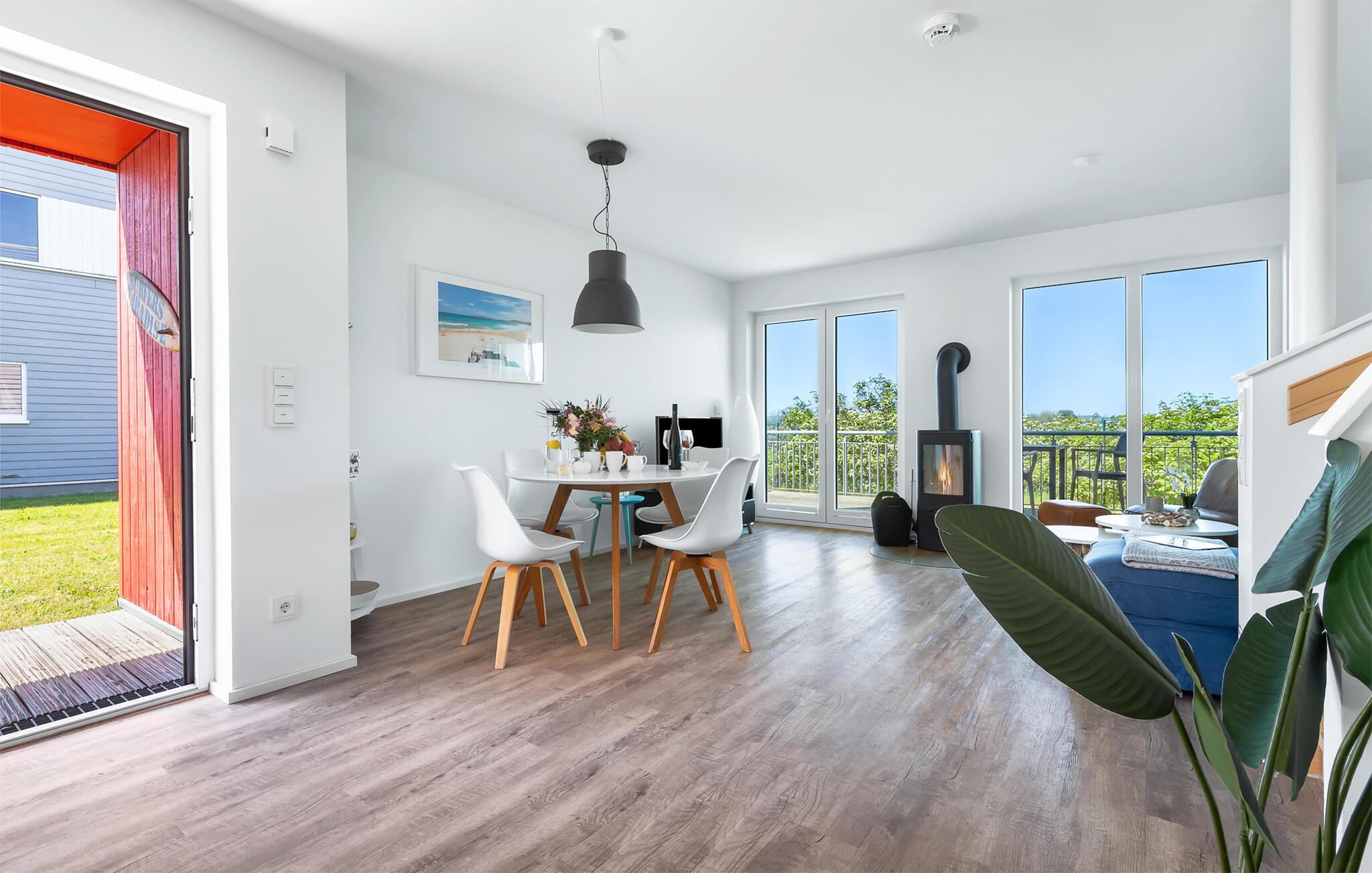Der lichtdurchflutete Wohn- und Essbereich befindet sich im Erdgeschoss und besticht mit bodentiefen Fenstern und Panoramablick auf die Schlei. Von hier aus gelangt man direkt auf die angrenzende Terrasse. Diese Terrasse punktet mit Süd-West Ausrichtung und traumhaften Sonnenuntergängen