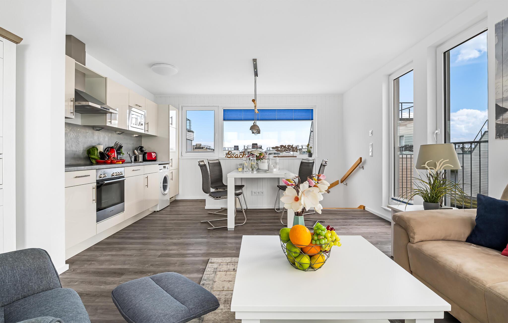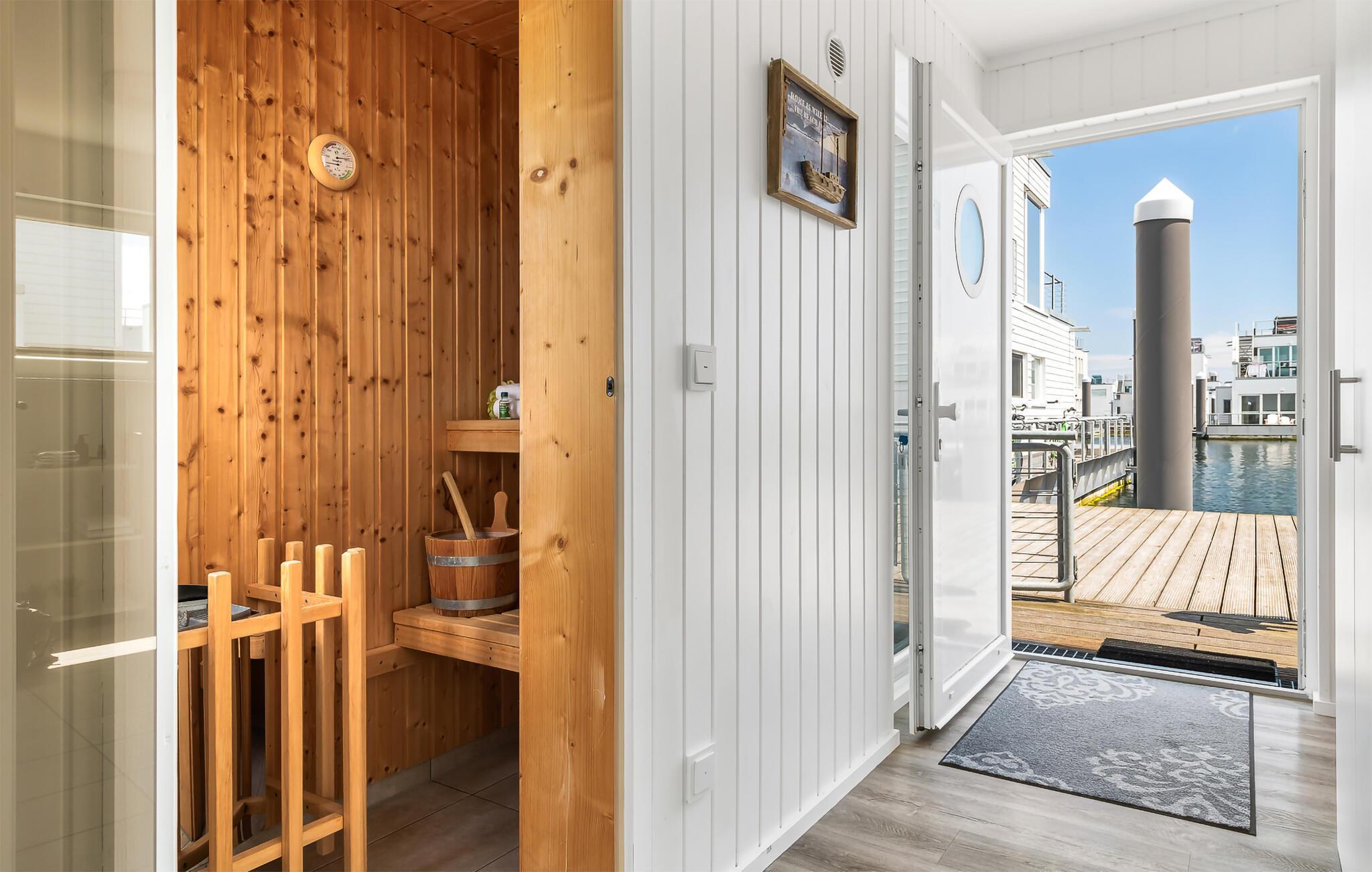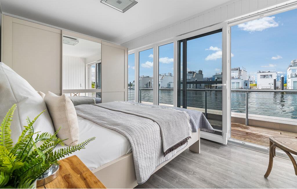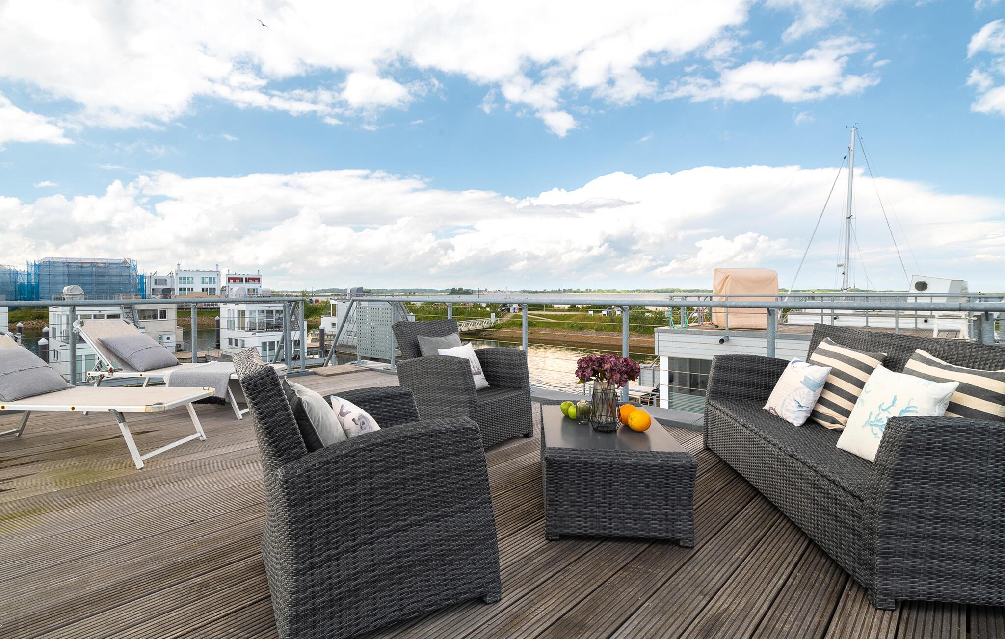 Das schwimmende Haus erstreckt sich über drei Ebenen, wobei das Obergeschoss mit einem offenen Wohn- und Essbereich punktet. Die voll ausgestattete Wohnküche und die angrenzende Terrasse bieten nicht nur kulinarische Freuden, sondern auch einen beeindruckenden Wasserblick. Von hier aus führt der Weg zur spektakulären Dachterrasse, ausgestattet mit hochwertigen Möbeln und einem Weber Elektrogrill, der ideale Ort, um das Urlaubsgefühl zu zelebrieren und atemberaubende Sonnenuntergänge zu erleben.