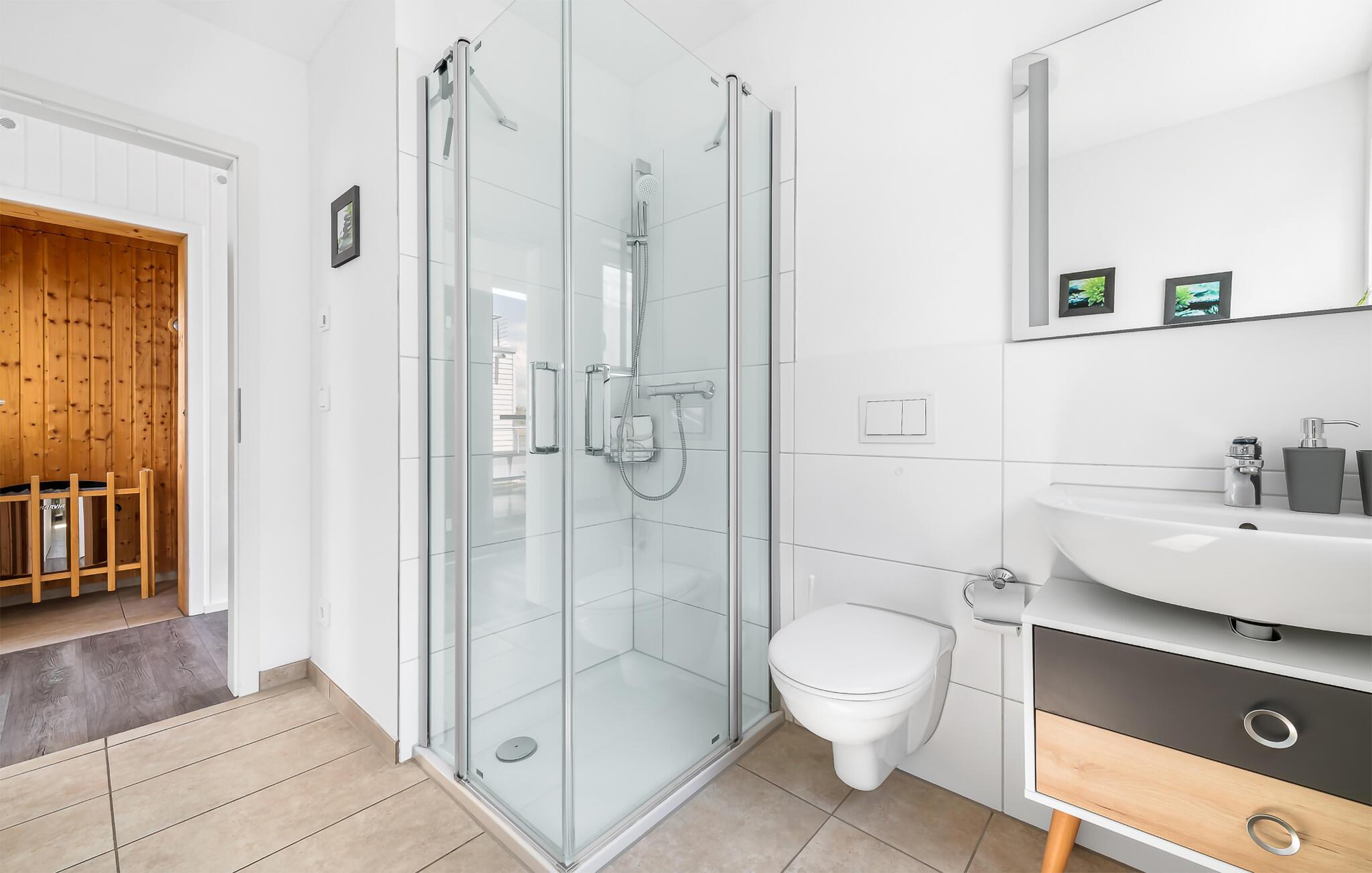 Die Ruheoase des Hauses befindet sich im Erdgeschoss mit zwei Schlafzimmern, einem Badezimmer und einer Sauna. Das Hauptschlafzimmer besticht durch bodentiefe Panoramafenster und eine umlaufende Terrasse, die einen faszinierenden Blick auf das Wasser bietet. Das zweite Schlafzimmer, ausgestattet mit zwei Einzelbetten und einem zusätzlichen TV, verspricht gemütliche Nächte und entspannte Stunden.