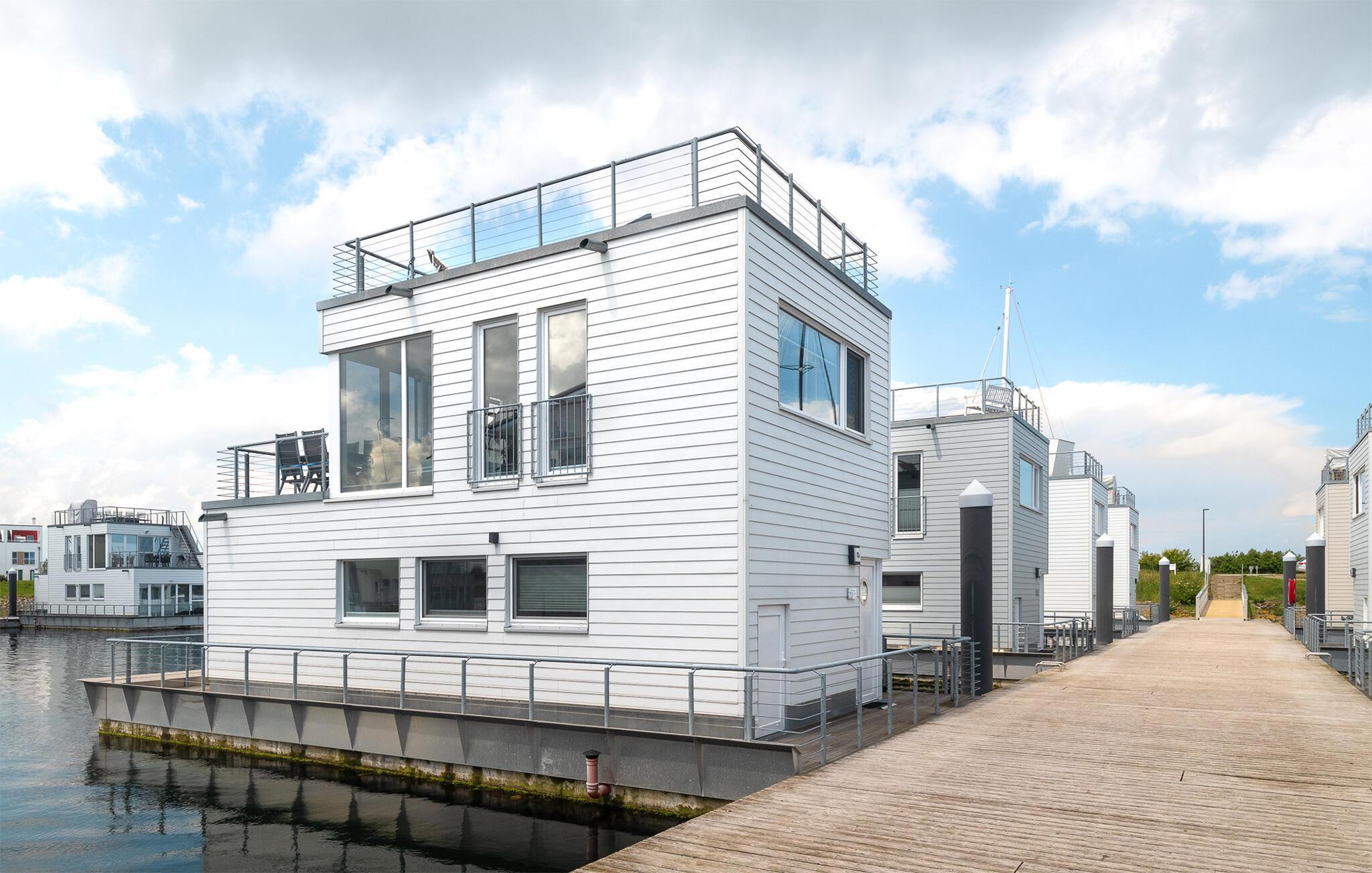 Erleben Sie Luxus und Entspannung in diesem einzigartigen schwimmenden Ferienhaus mit Panoramablick im OstseeResort Olpenitz.