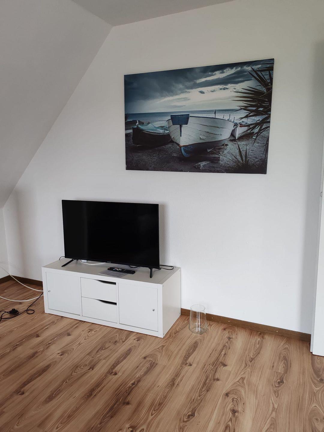 Wohnzimmer: Gemütliches Sofa, TV, Kommode und Garderobe sorgen für eine angenehme Atmosphäre.