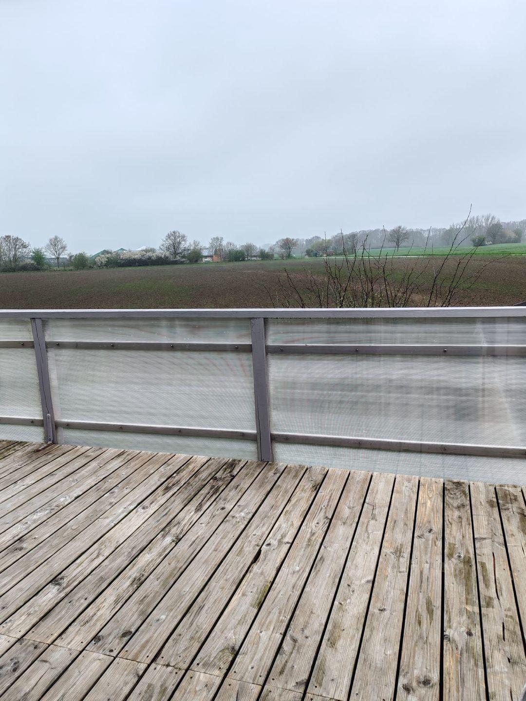 Genießen Sie die Sonne auf dem überdachten Balkon mit zwei Sonnenliegen, Gartenmöbeln und Sonnenschirm – perfekt für entspannte Stunden im Freien.