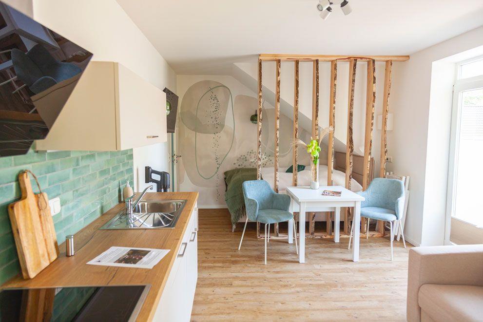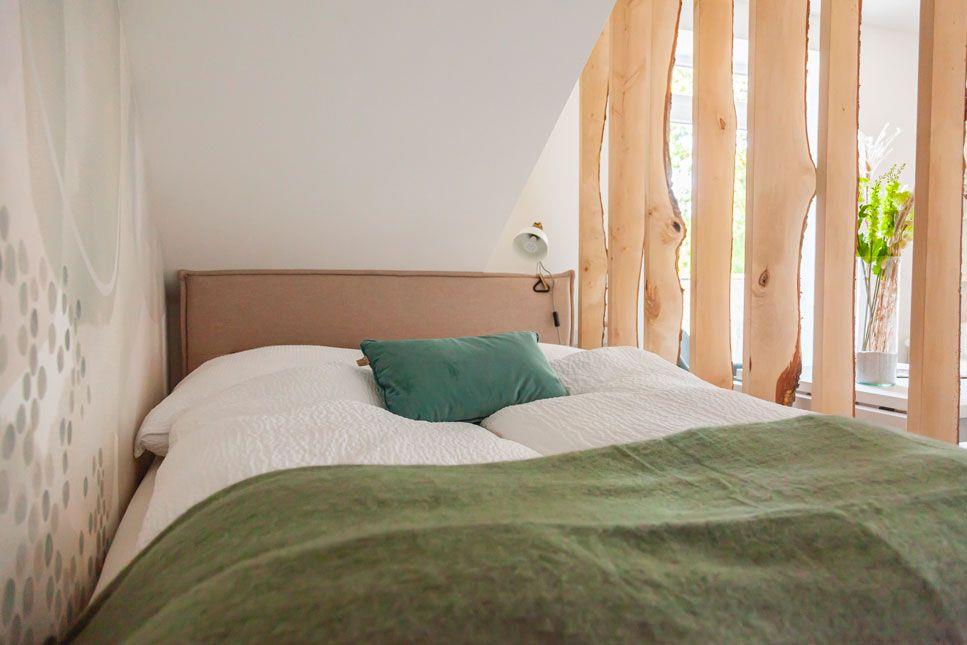 Diese stylische Ferienwohnung lädt zum Entspannen ein – inspiriert den Donots, aber ohne große Bühne, sondern mit dem Charme eines Rückzugsorts. Das Highlight: die eigene kleine Dachterrasse, perfekt für ruhige Momente unter freiem Himmel. Das Bett versteckt sich charmant hinter einem halboffenen Raumtrenner aus rustikalen Birkenholz-Bohlen, der den Raum in eine kuschelige Oase verwandelt. Hier könnt ihr richtig abschalten und die Seele baumeln lassen!