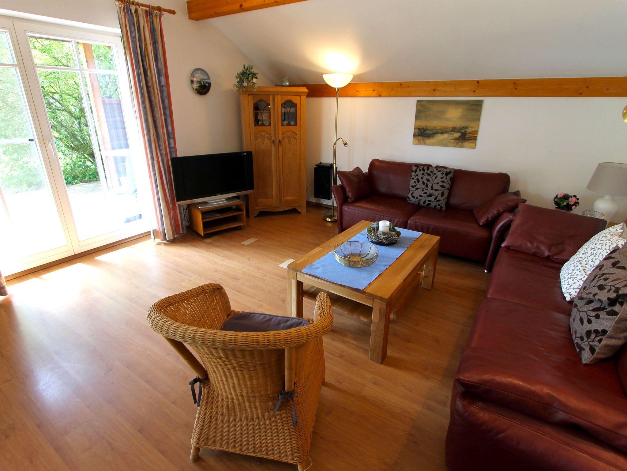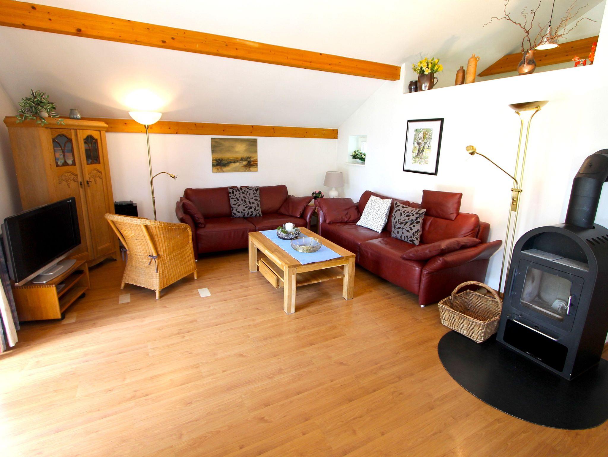 Im Wohnraum finden Sie eine gemütliche Couchecke mit Sat- TV und Kamin, darin integriert befindet sich der Essbereich mit Tisch und Stühlen.