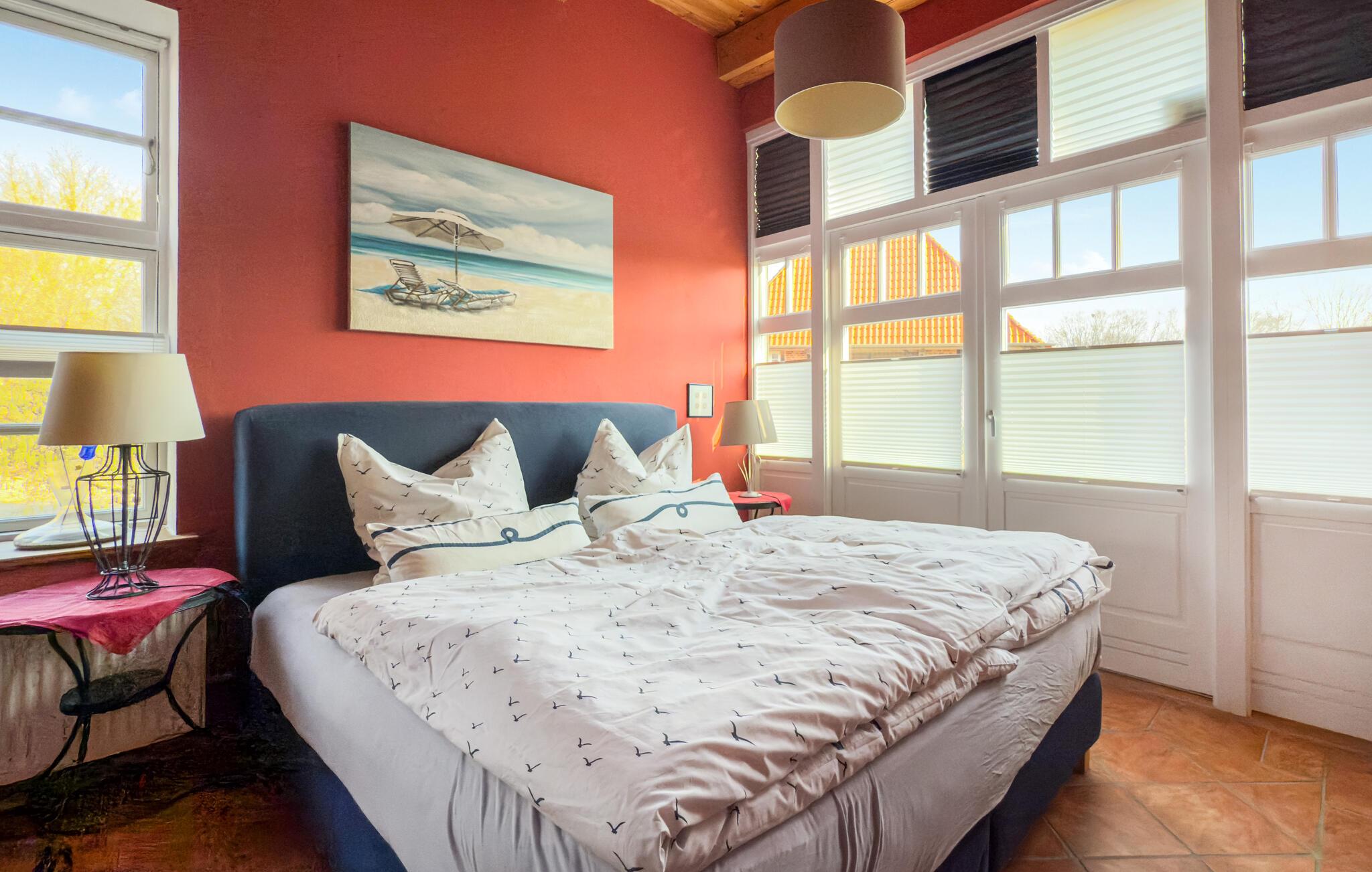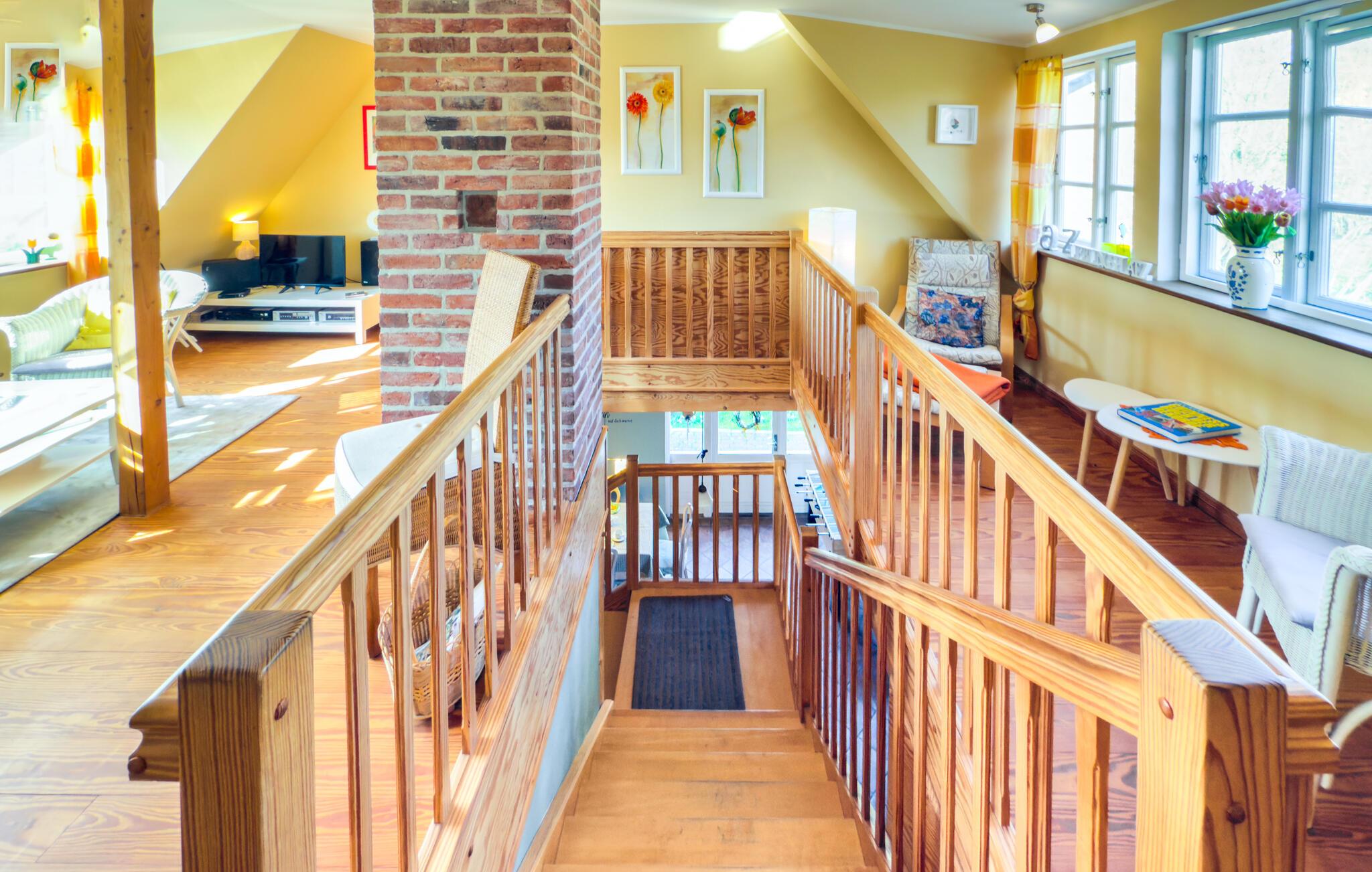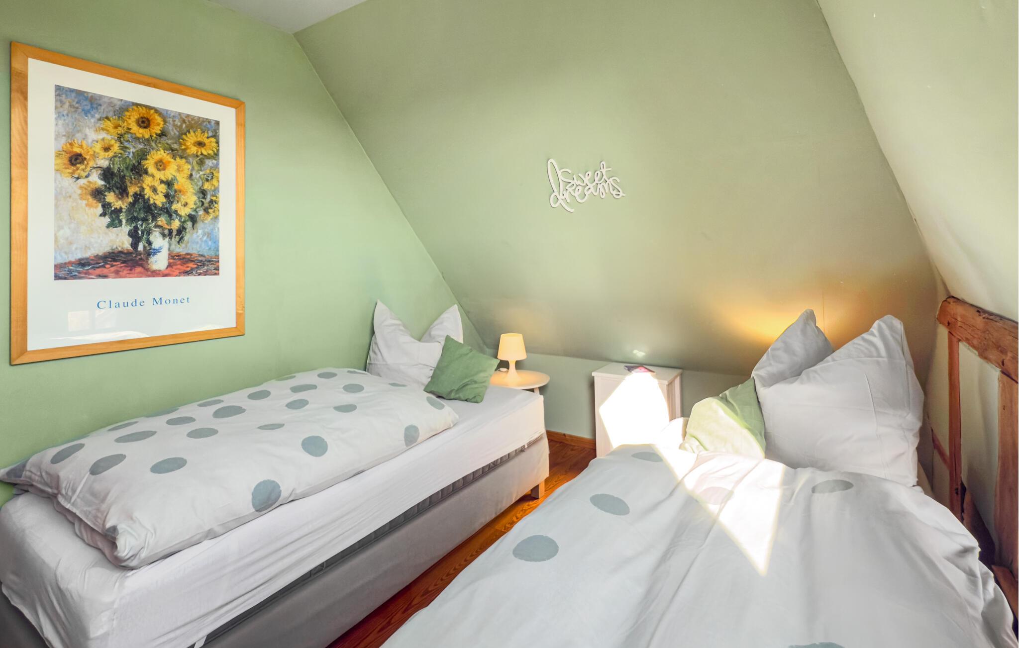 Idyllisch und zentral gelegen verbringen Sie hier einen entspannten und unvergesslichen Urlaub mit Ihrer Familie. Der Eingangsbereich im Erdgeschoss ist großzügig als auch stilvoll ausgebaut und integriert eine vollausgestattete Küche sowie einen Essbereich. Ein schönes Schlafzimmer mit Doppelbett, ein dazugehöriges Bad mit Dusche und ein begehbarer Kleiderschrank grenzen an. Ein zusätzliches Duschbad rundet die Ausstattung im Erdgeschoss ab. Über eine Treppe gelangen Sie in das Obergeschoss, das in einen offenen und gemütlichen Wohnbereich mündet und zwei helle sowie geschmackvolle Schlafzimmer mit Einzelbetten bietet.