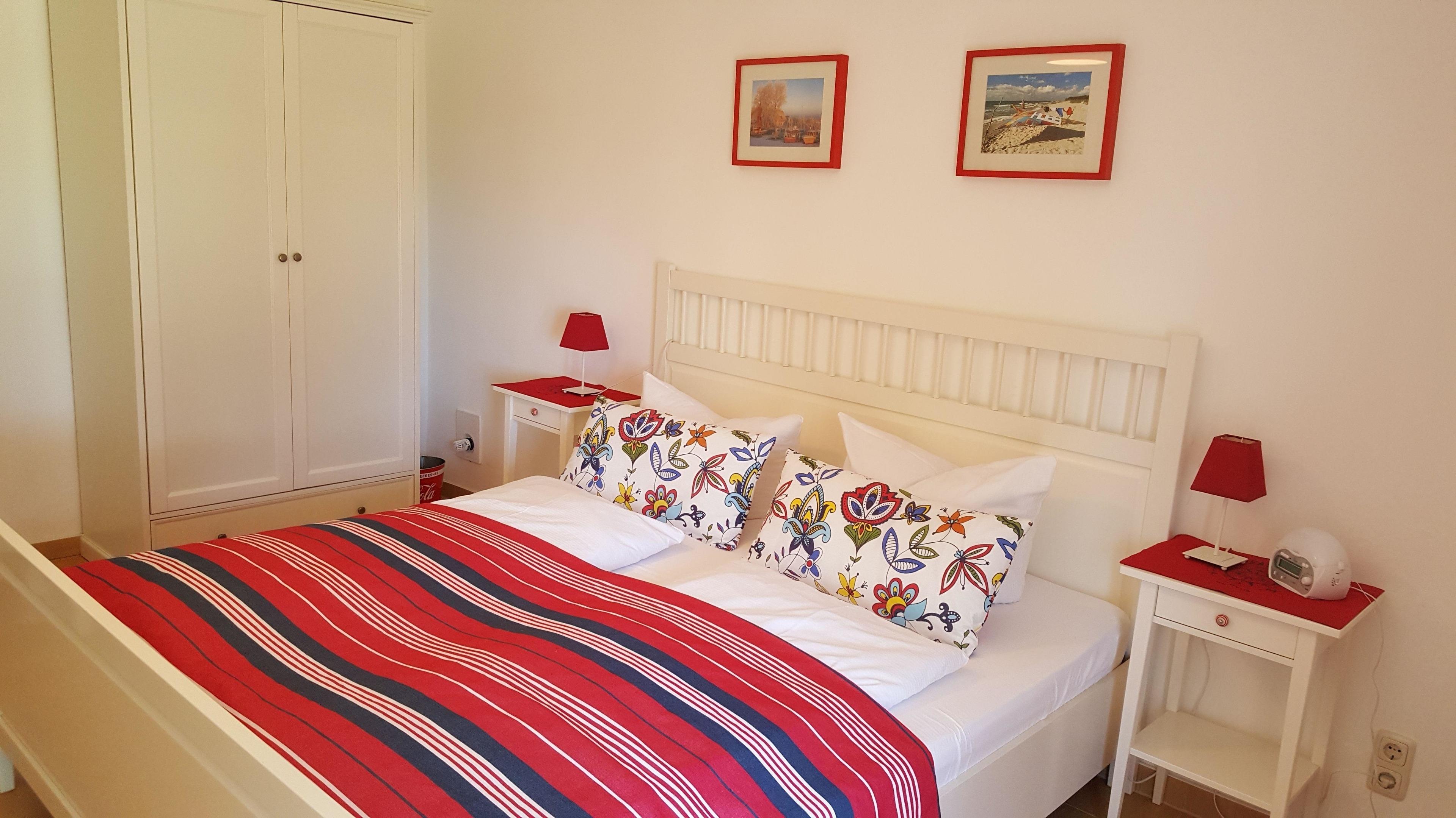 Die beiden Doppelbett-Schlafzimmer sind mit weißen Möbeln eingerichtet.