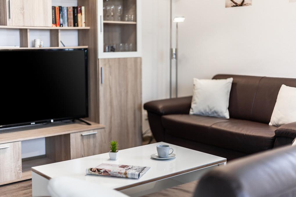 Das Wohnzimmer mit einer gemütlichen Couch bietet Ruhe und Entspannung. Ein Flachbildschirm und eine Stereoanlage sorgen für die musikalische Unterhaltung.
