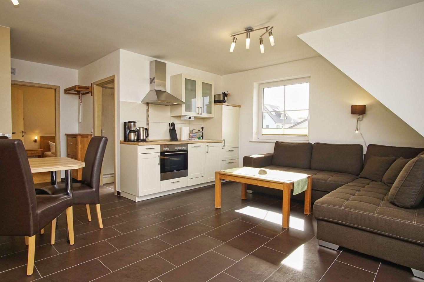 KÜCHE // offene Küche, 4-Platten Cerankochfeld, Spülmaschine, Kühlschrank mit Gefrierfach, Backofen, Toaster, Wasserkocher, Kaffeemaschine, reichlich Besteck, Geschirr und Küchenutensilien ++