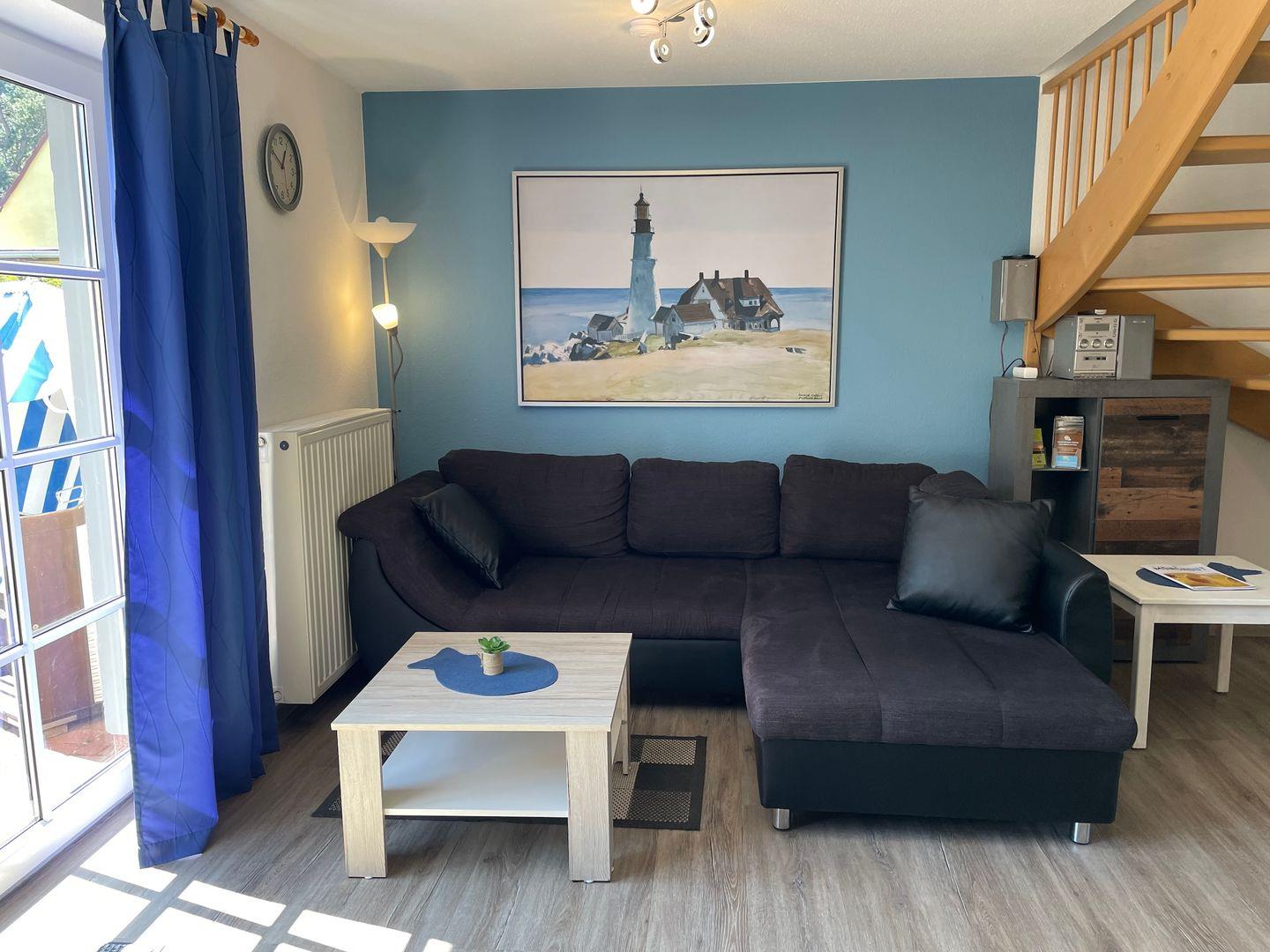 Im EG befindet sich das Wohnzimmer mit einer gemütlichen Couch. Ein Flachbildschirm und eine Stereoanlage sorgen für die musikalische Unterhaltung.
