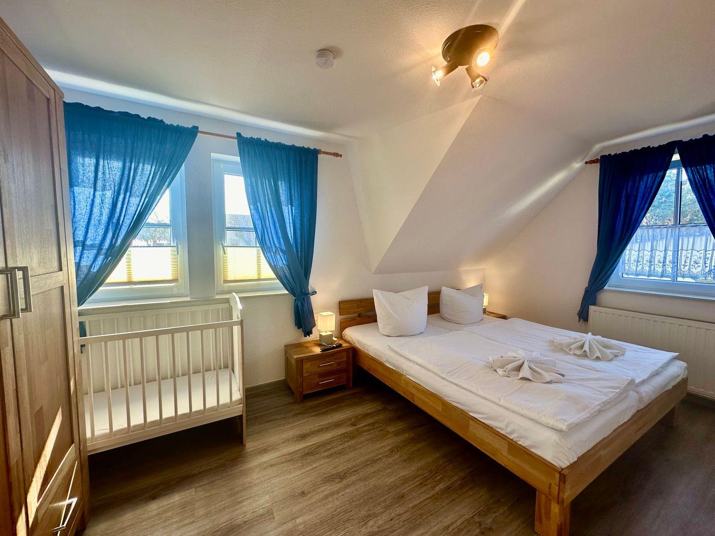 Im OG befindet sich das Elternschlafzimmer mit einem Doppelbett 180cmx200cm und einem eigenem Flachbildschirm, damit es keinen Streit beim Fernsehprogramm gibt.
