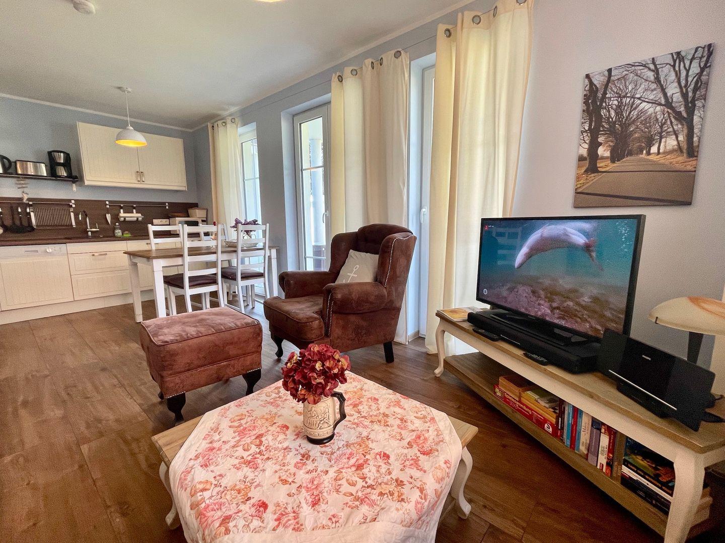 Dieses traumhaft gelegene Apartment genügt höchsten Ansprüchen und wurde mit viel Liebe zum Detail geschmackvoll eingerichtet. Die wunderschöne Nichtraucher-Wohnung liegt im Erdgeschoß und ist gut geeignet für Familien mit Kindern und ältere Gäste. Mit 55 qm Wohnfläche bietet sie genug Platz für 2 Erwachsene, 1 Kind und ein kleines Kind bis 3 Jahren im Kinderreisebett. Die Wohnung hat drei Zimmer und modern ausgestattetes Bad mit einer ebenerdigen Dusche. Der helle Wohn/Essbereich mit großer Fensterfront bietet einen wunderbaren Blick auf den großen Garten. Die Küche ist eingebunden in den Wohn/Essbereich und mit Cerankochfeld, Kühlschrank, Geschirrspüler, Mikrowelle, Wasserkocher, Kaffeemaschine, Toaster und vielen Küchenhelfern ausgestattet. Im Essbereich steht ein massiver Esstisch mit 4 Stühlen. Der Wohnbereich ist im Landhausstyle eingerichtet, hier befindet sich eine gemütliche Sitzecke mit einer Couch, einem bequemen Ohrensessel, ein Sideboard und Couchtisch. Die HiFi Ausstattung besteht aus einer CD und Blue-Ray Soundbar und natürlich einem Full-HD Fernseher. Für kühlere Tage gibt es einen Kaminofen.