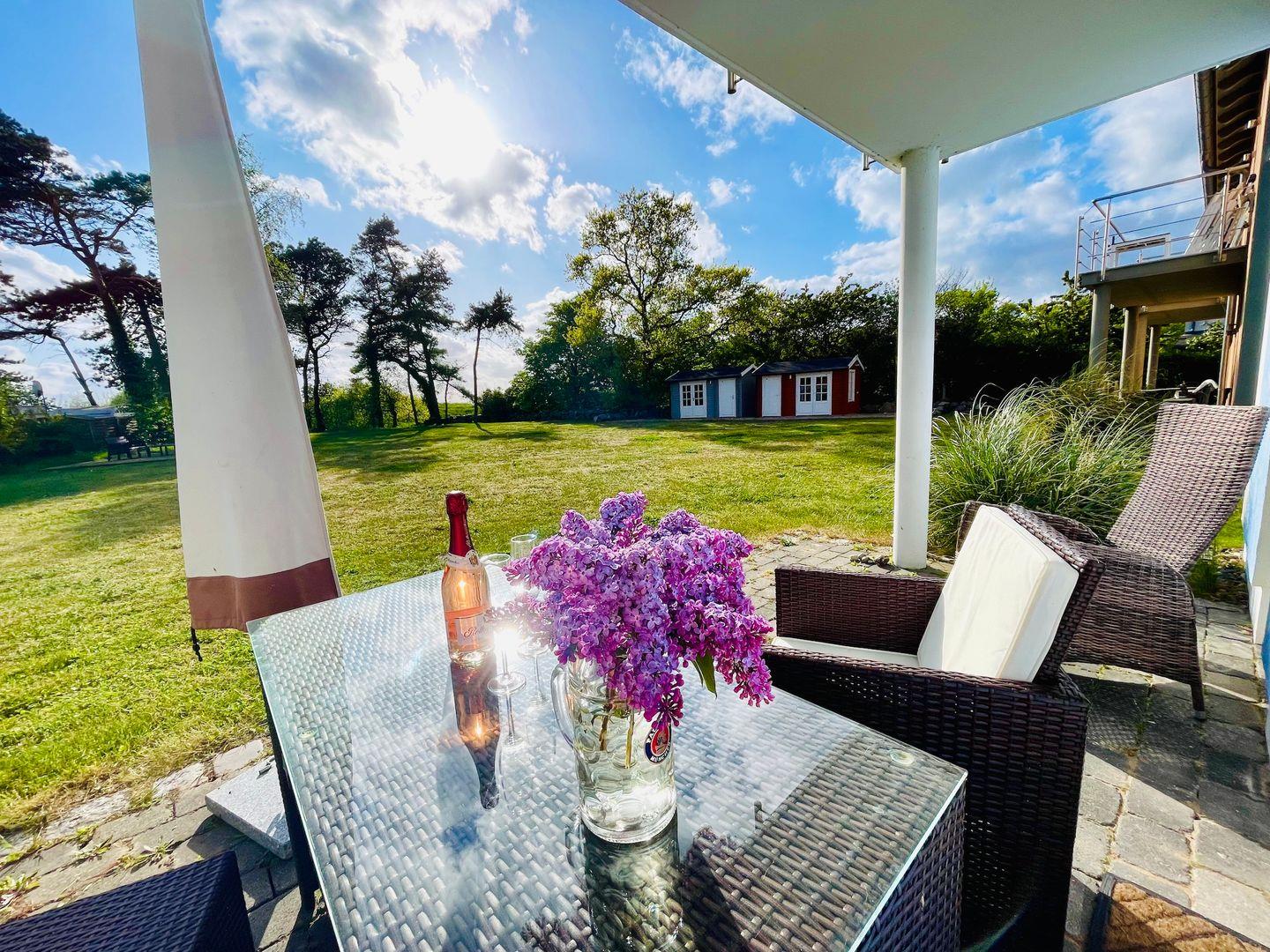 Auf der Terrasse mit bequemen Loungemöbeln bietet sich ein wunderbarer Blick in den Garten und das angrenzende Dünengebiet.