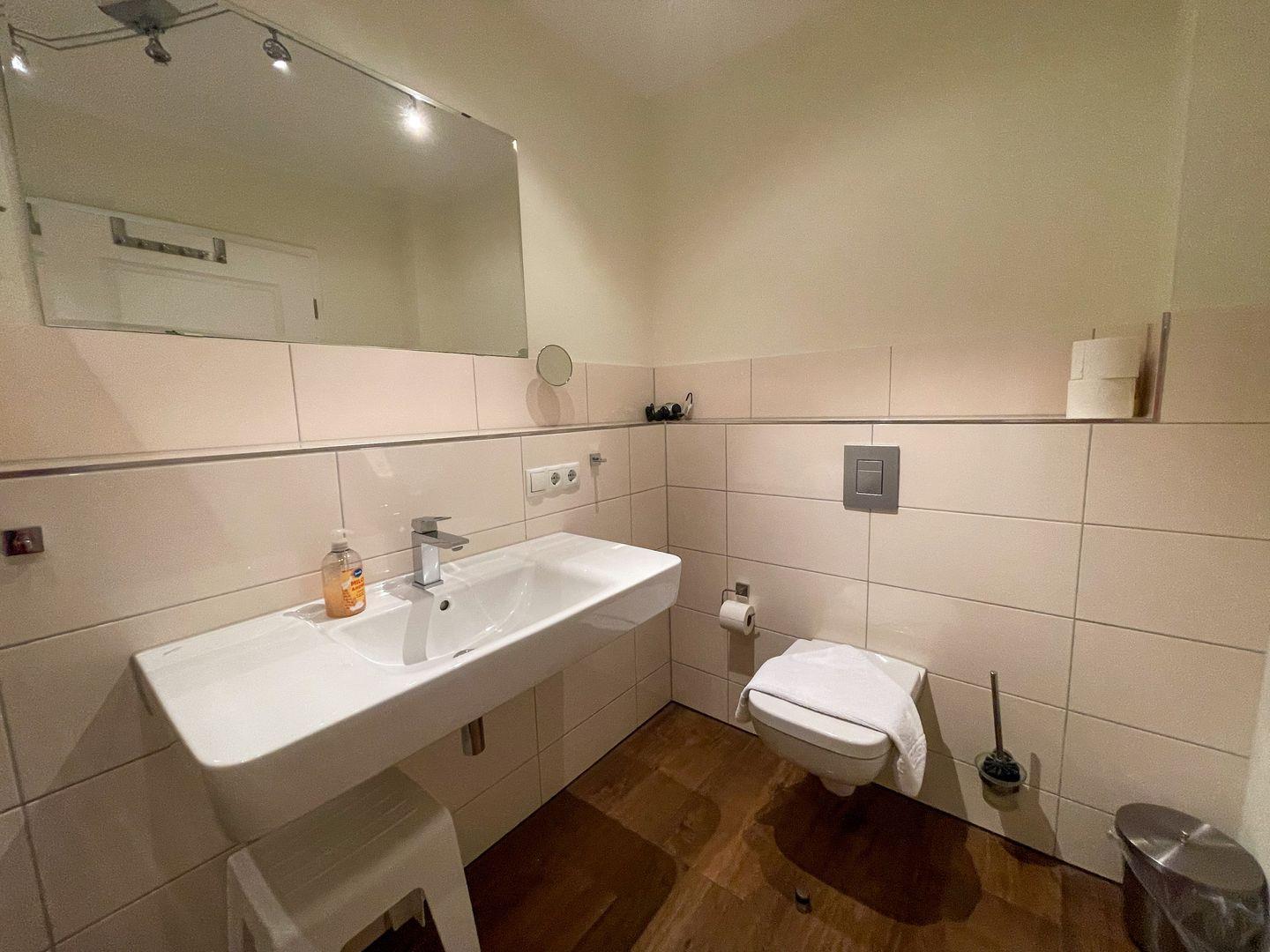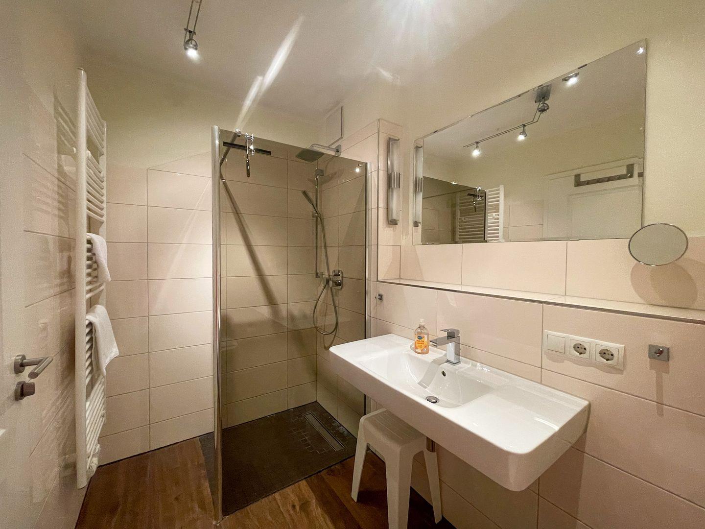 Das Bad ist großzügig und modern mit ebenerdiger Dusche, WC, Waschtisch, Kosmetikspiegel, Fön und Handtuchtrockner ausgestattet. Für die Wärme in den Räumen sorgt eine Fußbodenheizung.