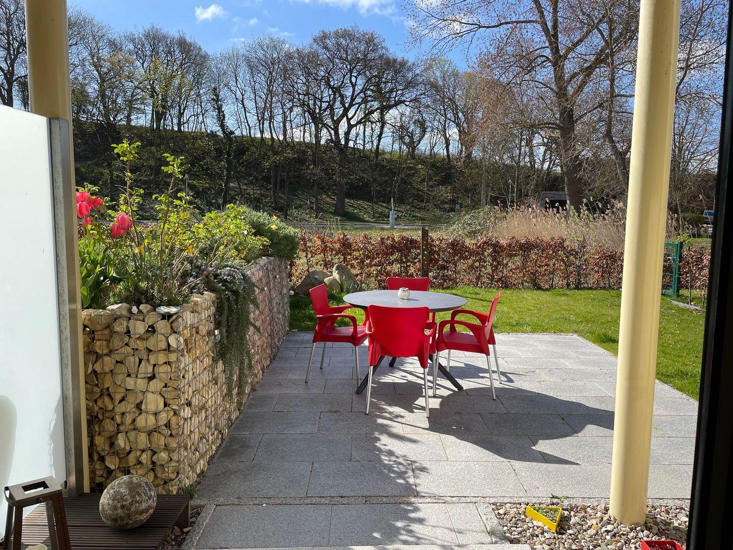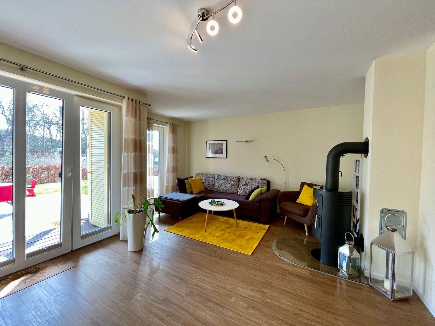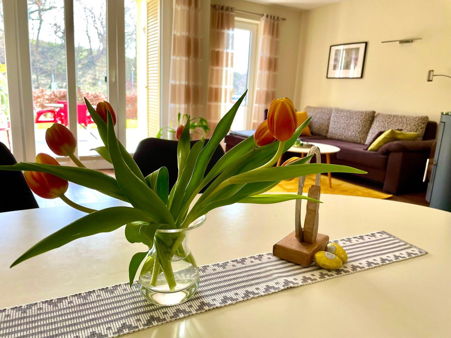 Die große Zwei-Zimmerwohnung liegt im Erdgeschoss mit Zugang zur Südterrasse in einem kleinen Garten.