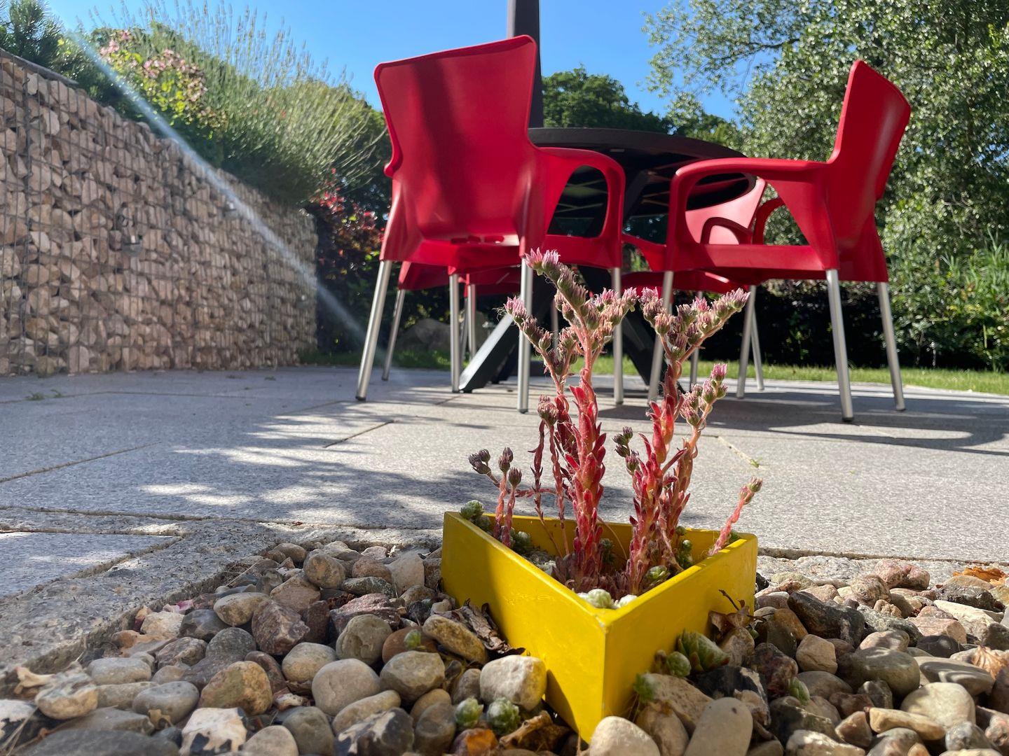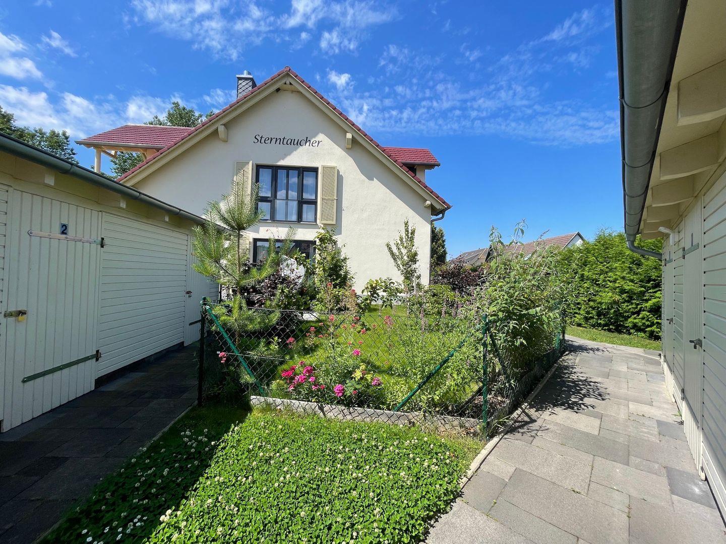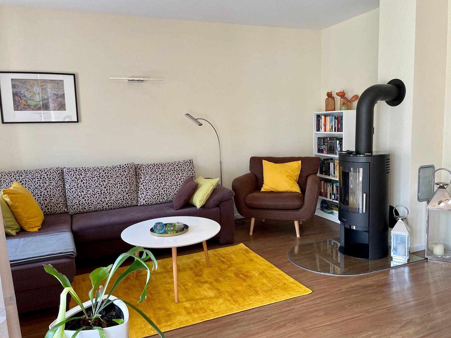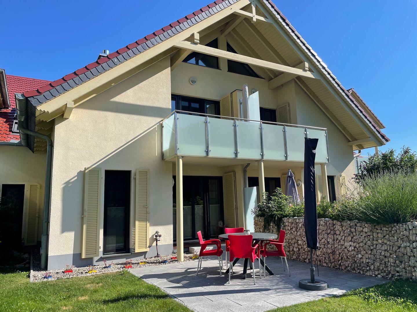 Die große Zwei-Zimmerwohnung liegt im Erdgeschoss mit Zugang zur Südterrasse in einem kleinen Garten.