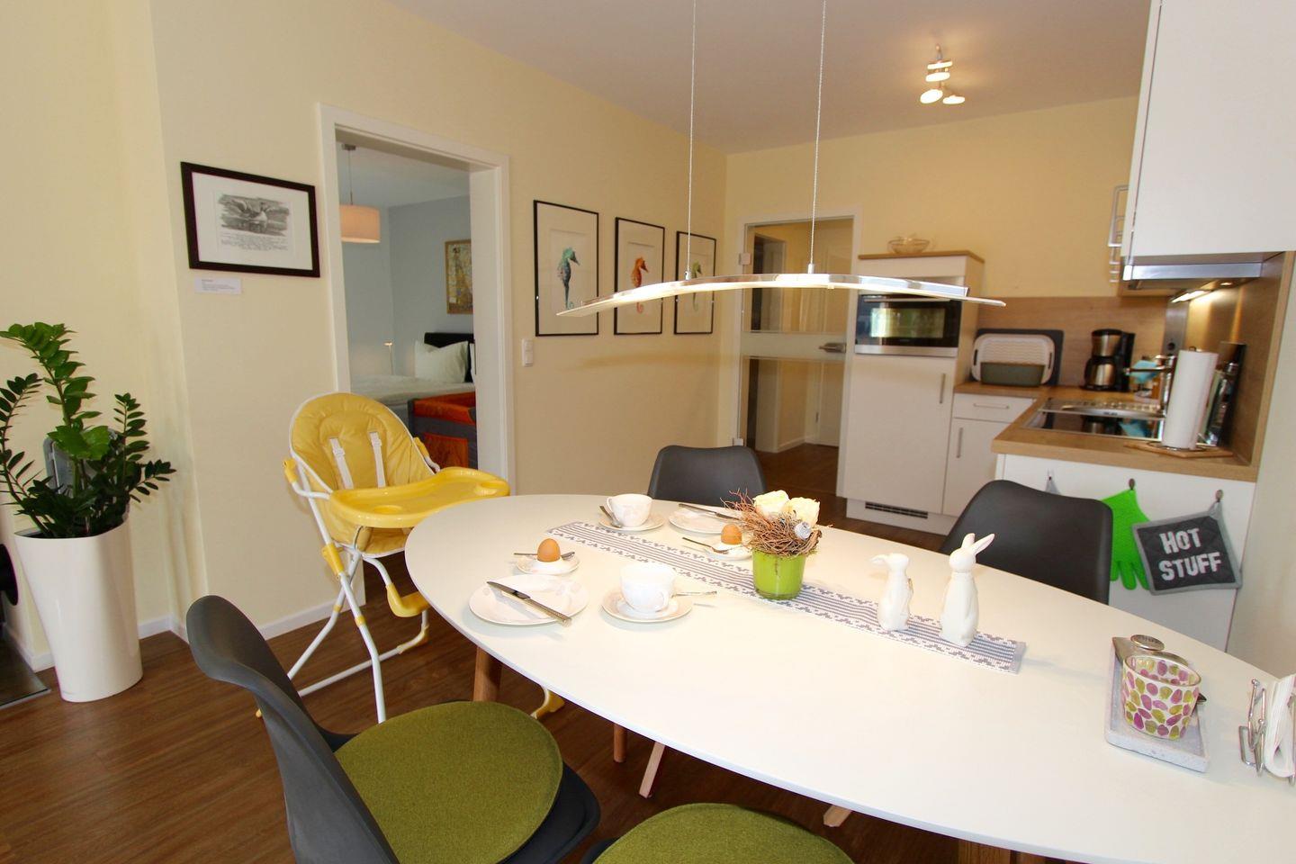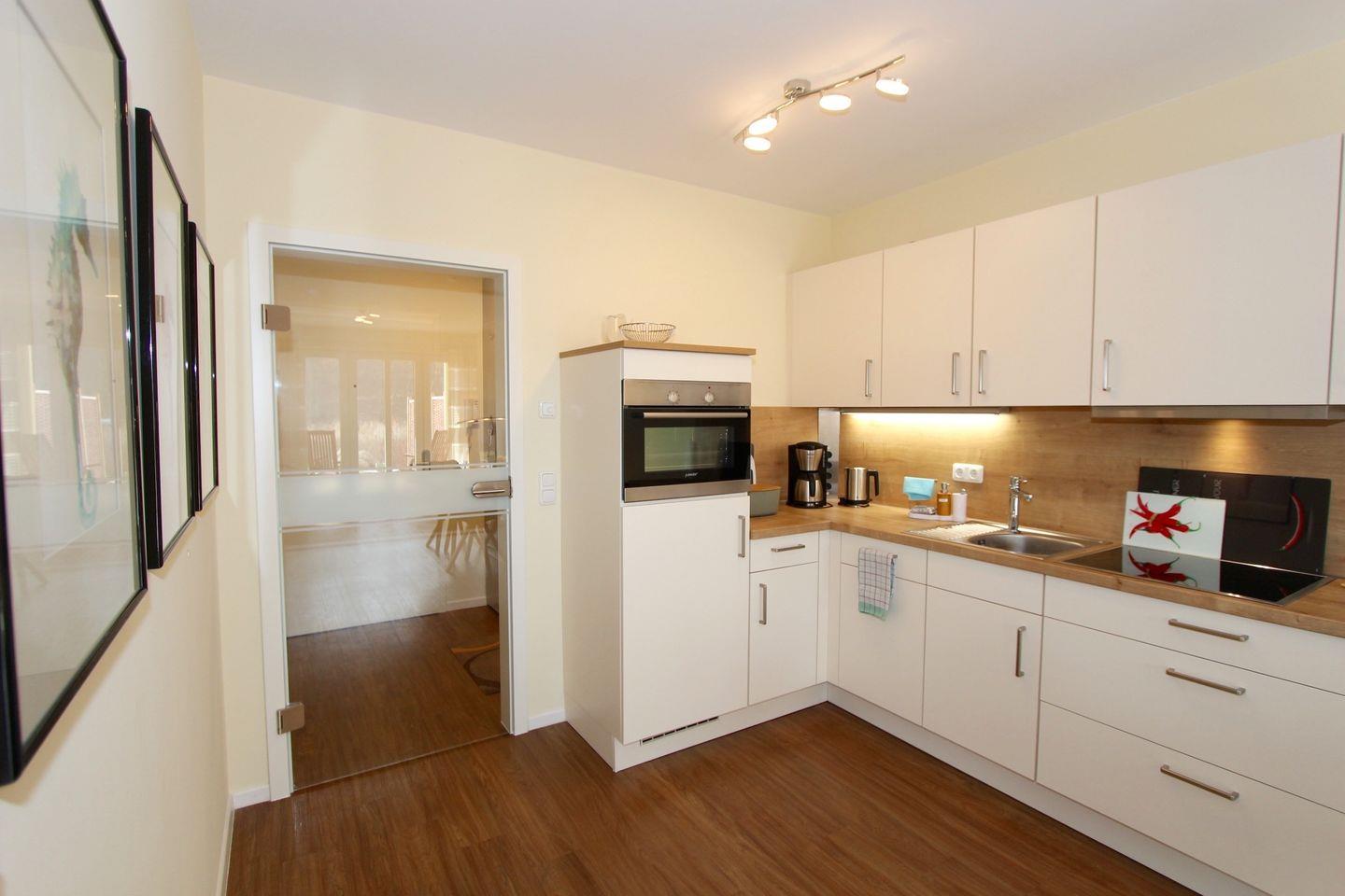 An den Wohnbereich schließt sich eine voll ausgestattete mit vielen Extras versehene, moderne Küche mit gemütlichem Essplatz an (Kaffeemaschine, Espressomaschine, Toaster, Wasserkocher, smothie maker, Mixer, Pürierstab, Backofen, Geschirrspüler, Tiefkühlfach).