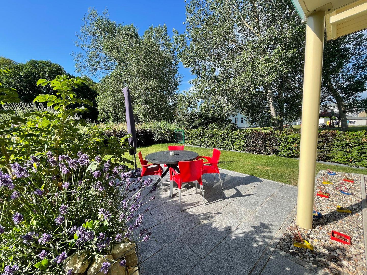 In der Diele finden Sie neben hinreichendem Stauraum Bügelbrett, Bügeleisen, Staubsauger, Hochstuhl, Wäscheständer sowie diverse Haushaltutensilien. Die Wohnung ist mit einer Fußbodenheizung ausgestattet und verfügt über Insektenschutz vor den Fenstern und Türen. Vom Wohnbereich aus betreten Sie eine große mit Granitplatten ausgelegte Südterrasse in einem kleinen Garten, die mit einer Teakholzsitzgruppe, zwei Liegen und einem großen Sonnenschirm ausgestattet ist. Kugelgrill ist vorhanden. Abstellmöglichkeiten für Ihre ausgeliehenen oder mitgebrachten Fahrräder und Strandutensilien stehen Ihnen in einem wohnungseigenen separaten Schuppen zur Verfügung. In diesem befindet sich auch ein entsprechend nutzbarer geländergängiger Bollerwagen.