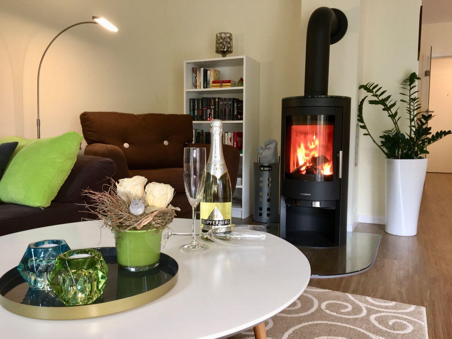 Im Wohnbereich finden Sie eine hochwertige Wohnlandschaft, die sich mit wenigen Handgriffen zur vollwertigen Schlafgelegenheit für zwei erwachsene Personen ausklappen lässt. Ein gemütlicher Sessel vor einem wärmenden Kaminofen läd dazu ein, in der mit liebevoll ausgewählten Büchern ausgestatteten kleinen Bibliothek zu stöbern. Das Appartement ist in Wohn- und Schlafbereich mit je einem TV-Gerät ausgestattet.