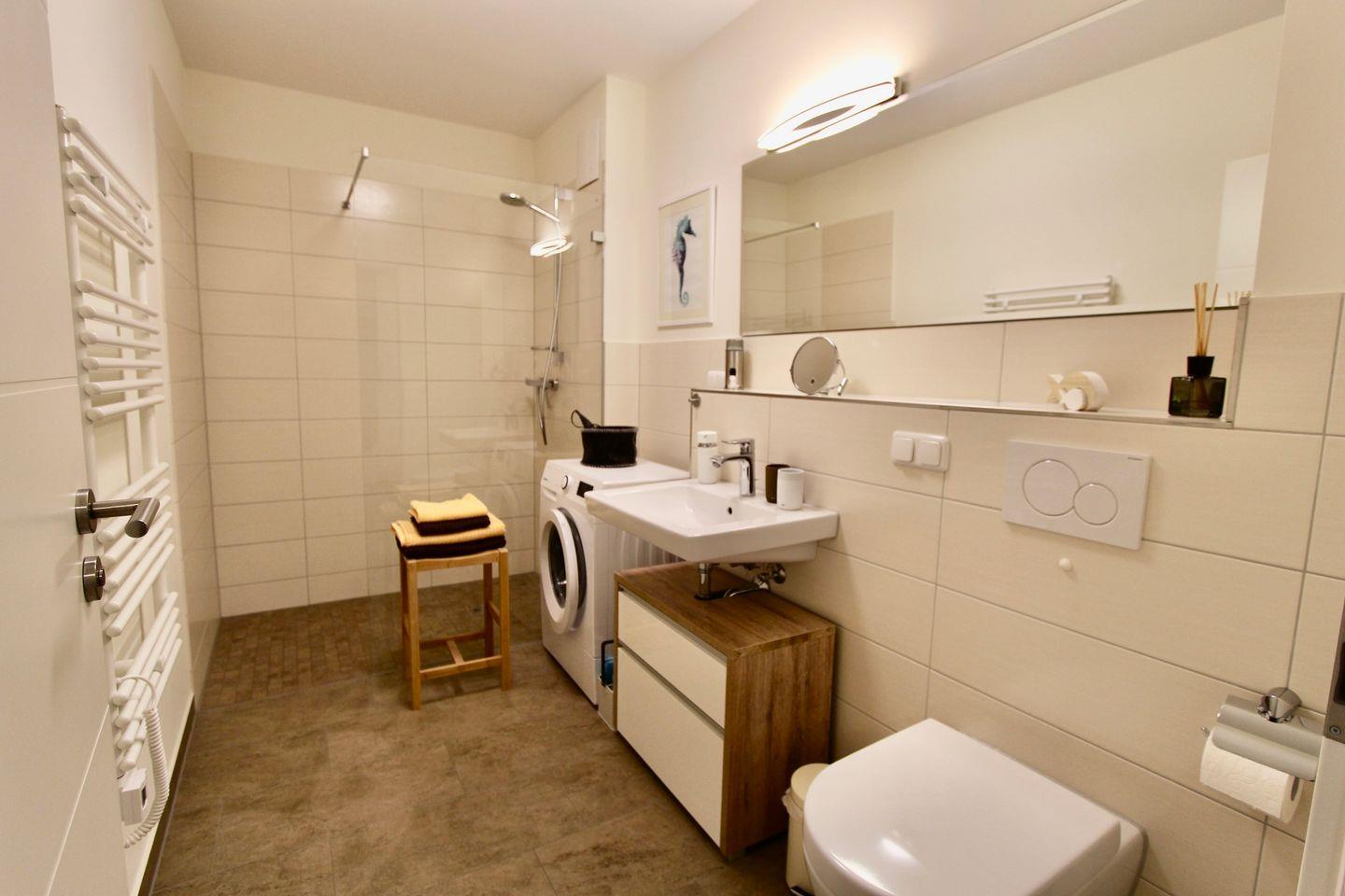 Das zur Wohnung gehörige Bad verfügt über eine ebenerdige Dusche, einen großen Waschtisch, großen Spiegel, Kosmetikspiegel, Föhn, Personenwaagee, beheizbaren Handtuchtrockner und eine Waschmaschine.