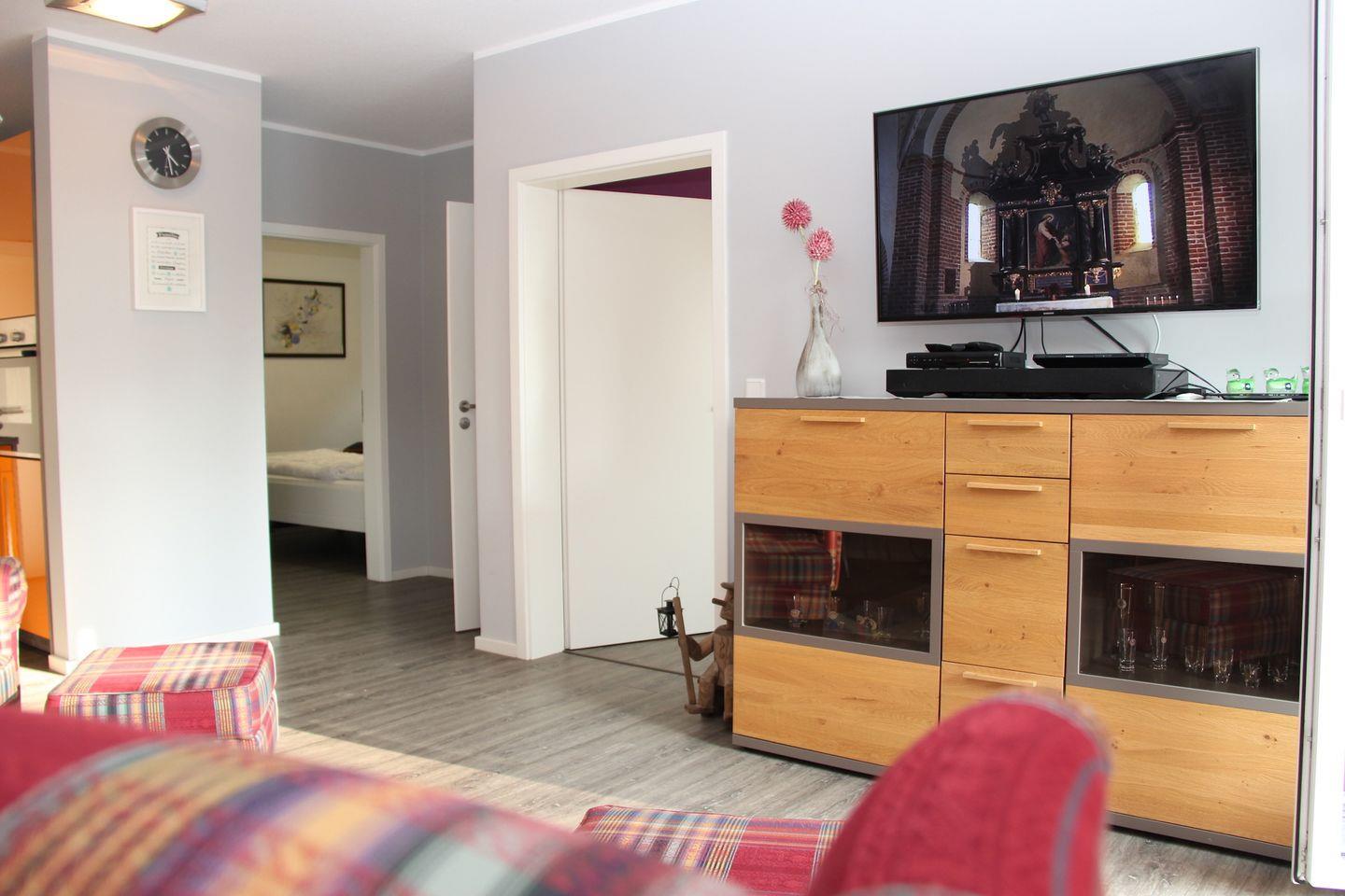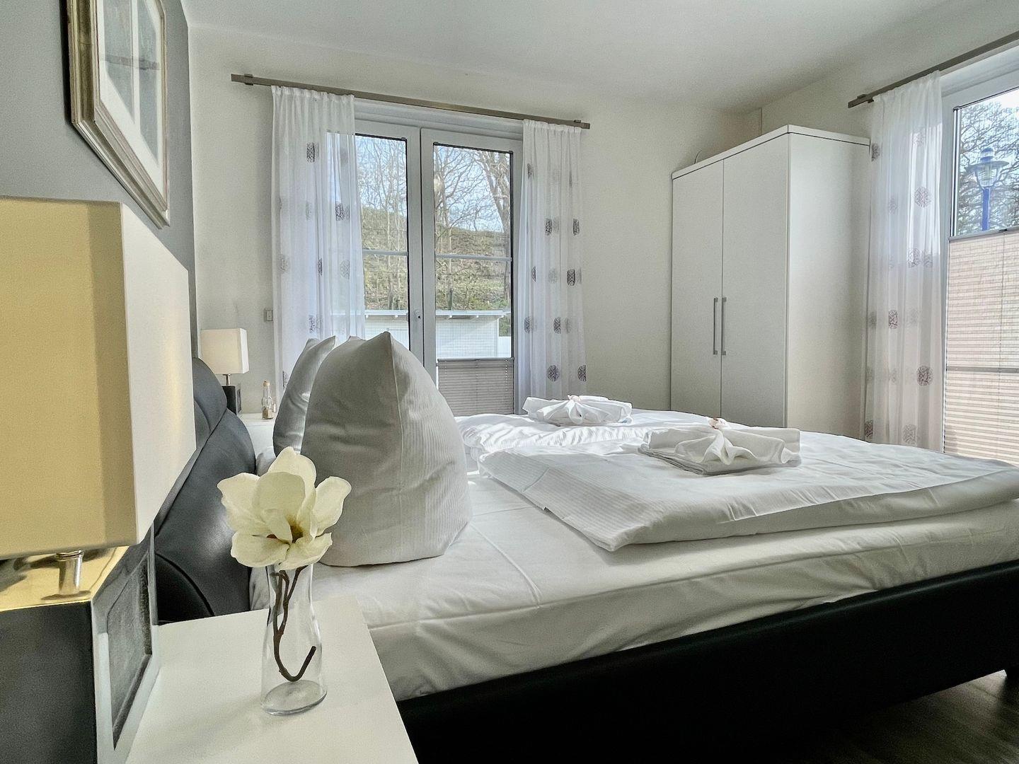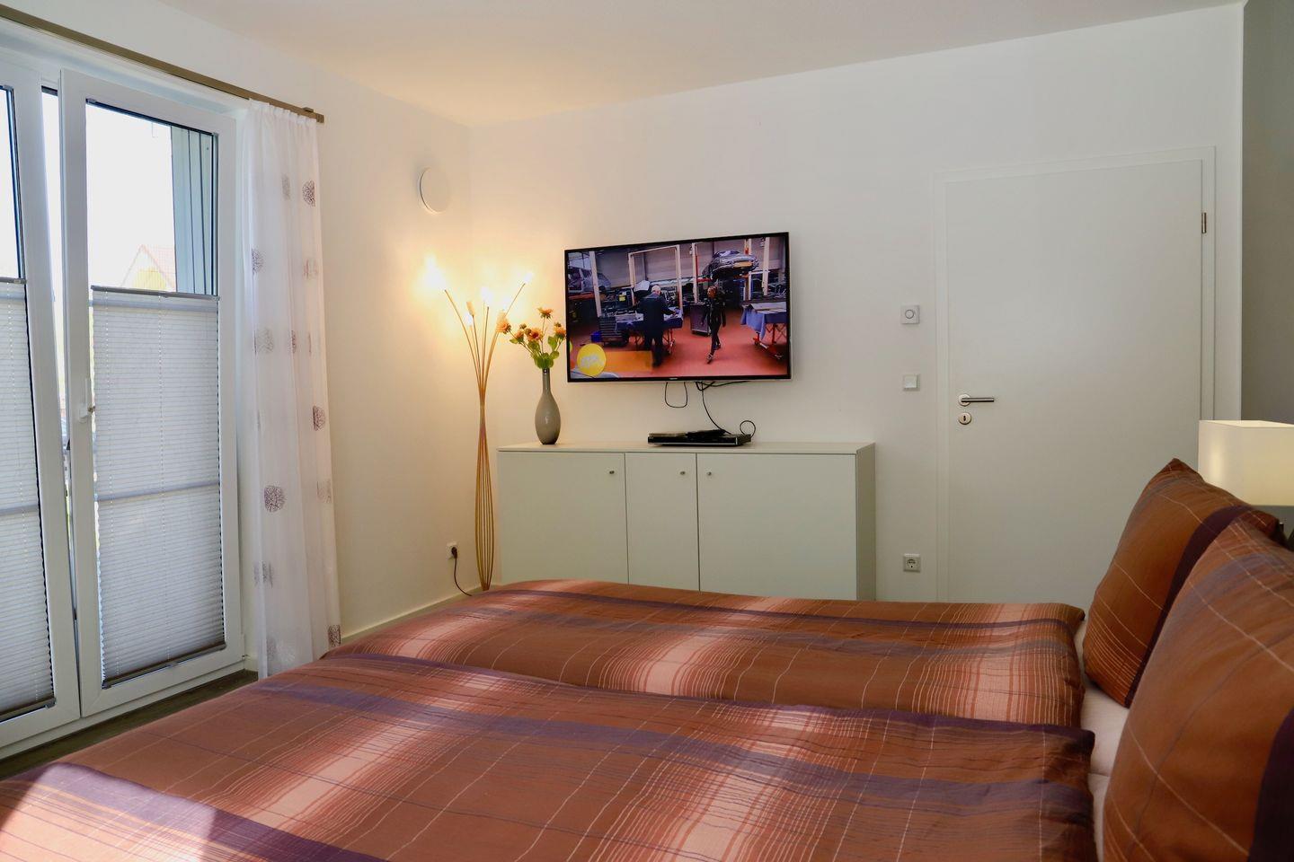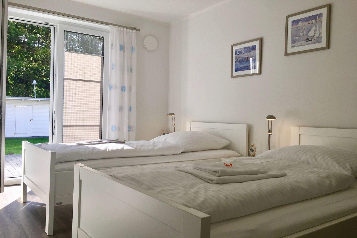 Die farbenfrohen und lichtdurchfluteten Räume sorgen für behagliche Urlaubsstimmung und bieten Platz für 4 Personen. In einem großen Schlafzimmer mit zwei bodentiefen Fenstern, befindet sich ein bequemes Doppelbett. Ein Flachbild-TV und ein DVD-Player sorgen für die Unterhaltung. Noch ein Schlafzimmer mit zwei Einzelbetten ist ebenfalls groß und hell. Ein modernes Tageslichtbad ist mit ebenerdiger Dusche, einem WC, und einem großen Waschtisch ausgestattet.