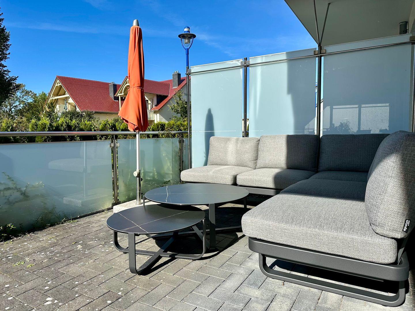 Die große Südwest Terrasse auf der Seite des Wohnzimmers, umfasst 30qm und ist mit einer gemütlichen Sitzlandschaft, grossem Esstisch, einem Sonnenschirm, einer elektrischen Markise und einem Grill ausgestattet. Auf der 10qm großen Ostsüdterrasse, die Sie aus beiden Schlafzimmern erreichen können, geniessen Sie die ersten Sonnenstrahlen.