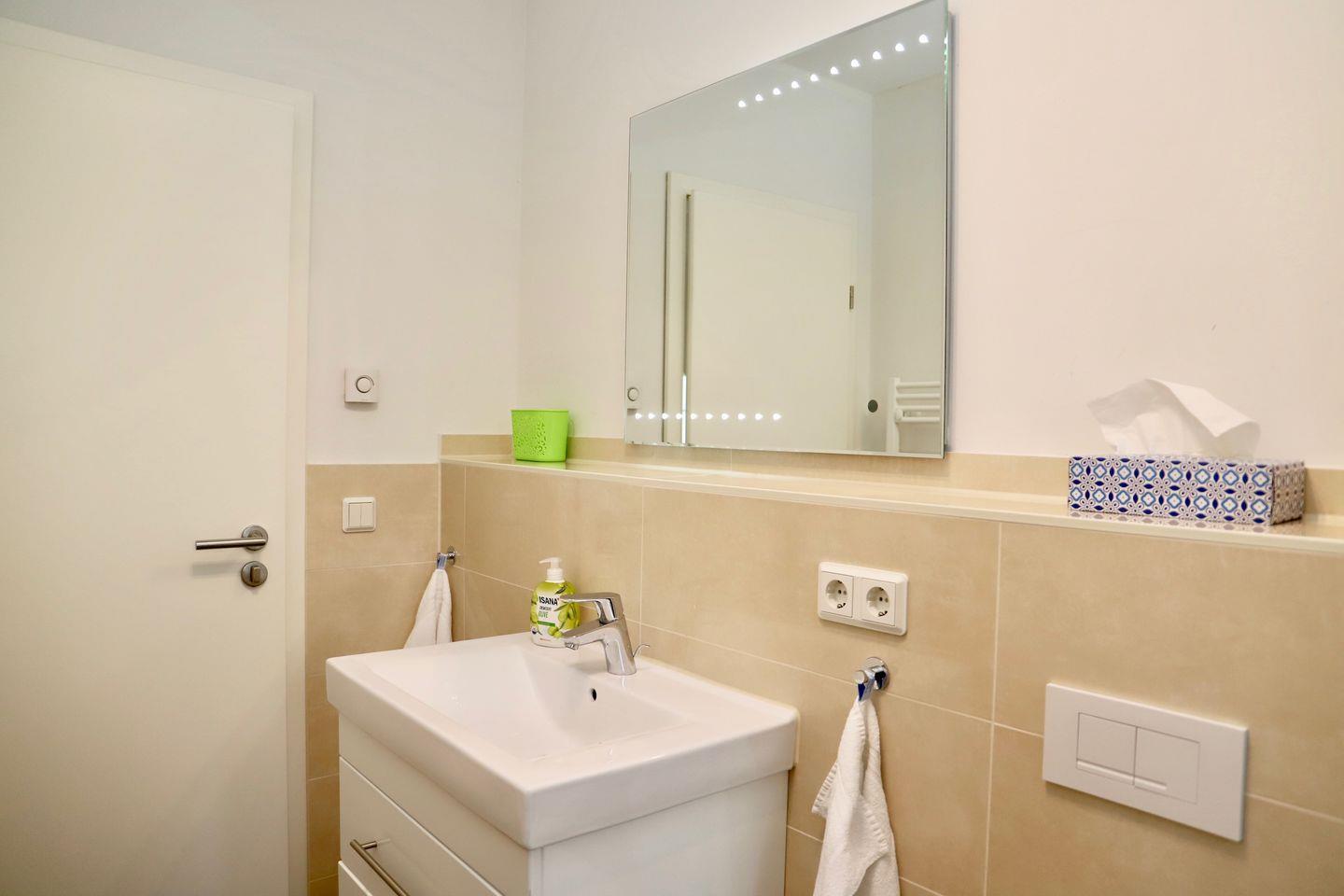Das moderne Tageslichtbad ist mit ebenerdiger Dusche, einem WC, und einem großen Waschtisch ausgestattet.