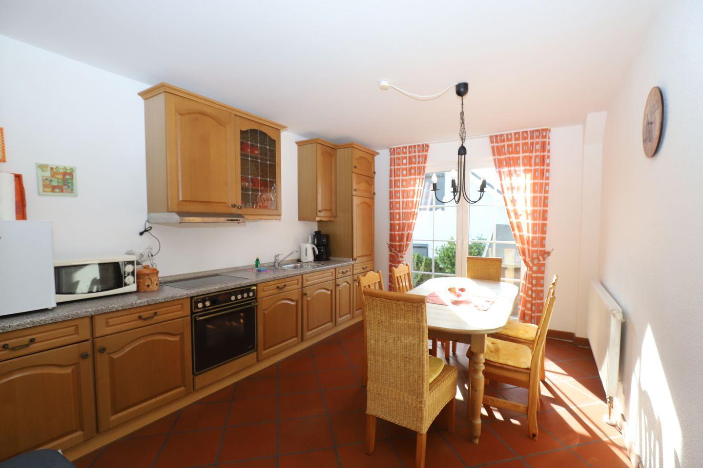 Für Freunde der kulinarischen Unabhängigkeit erfüllt die große, abgeschloßene Einbauküche die Ansprüche der heutigen Zeit und ist mit allem Zubehör komplettiert. An einem großen Tisch hat die gesamte Familie viel Platz.