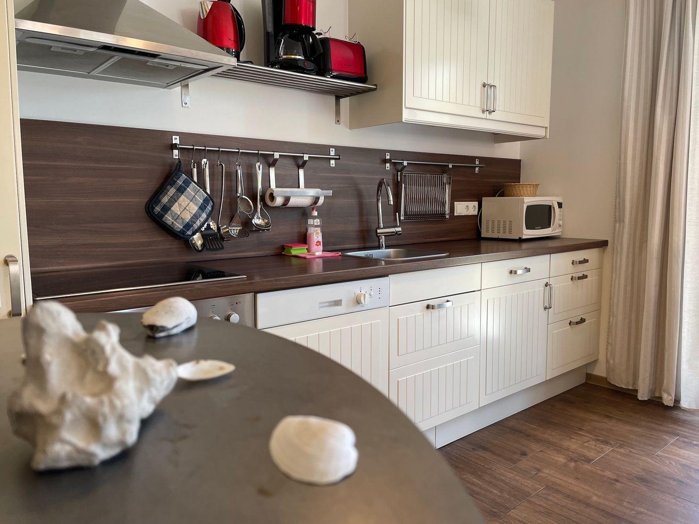 Eine integrierte moderne Küchenzeile mit Cerankochfeld, Kühl- und Gefrierschrank, Geschirrspüler, Mikrowelle kombiniert mit Grill und Heißluft (zum Beispiel zum Brötchen aufbacken), Wasserkocher, Kaffeemaschine, Toaster und diversen Küchenutensilien lässt keine Wünsche offen. Vom Balkon mit modernen Loungemöbeln haben Sie einen traumhaften Blick auf das Meer und das angrenzende Dünengebiet.