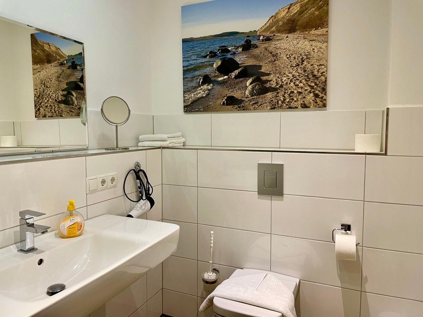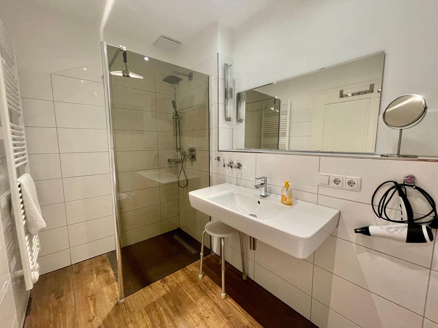 Das großzügige und moderne Bad hat ebenerdige Dusche, WC, Waschplatz, Kosmetikspiegel, Fön und Handtuchtrockner.