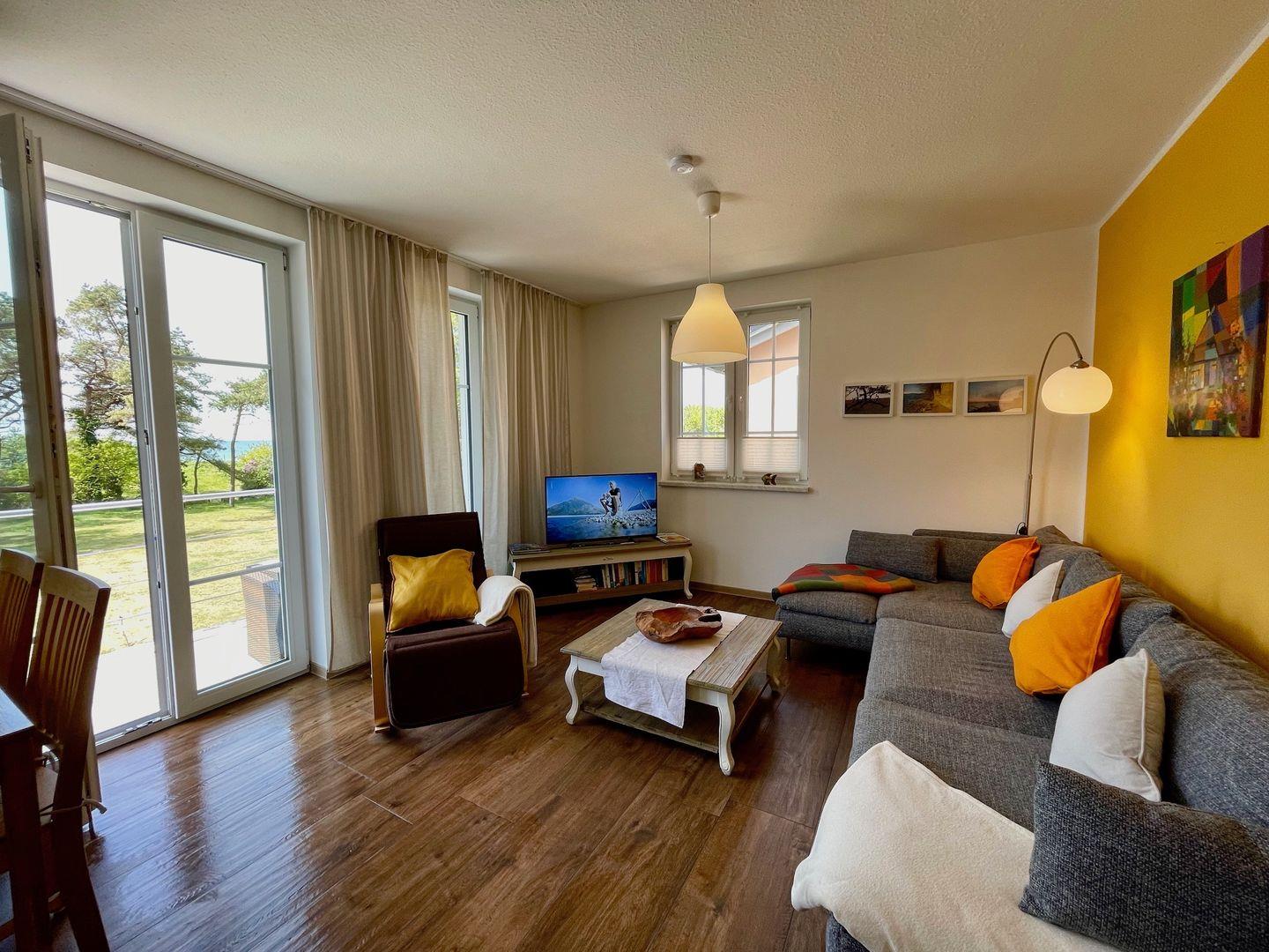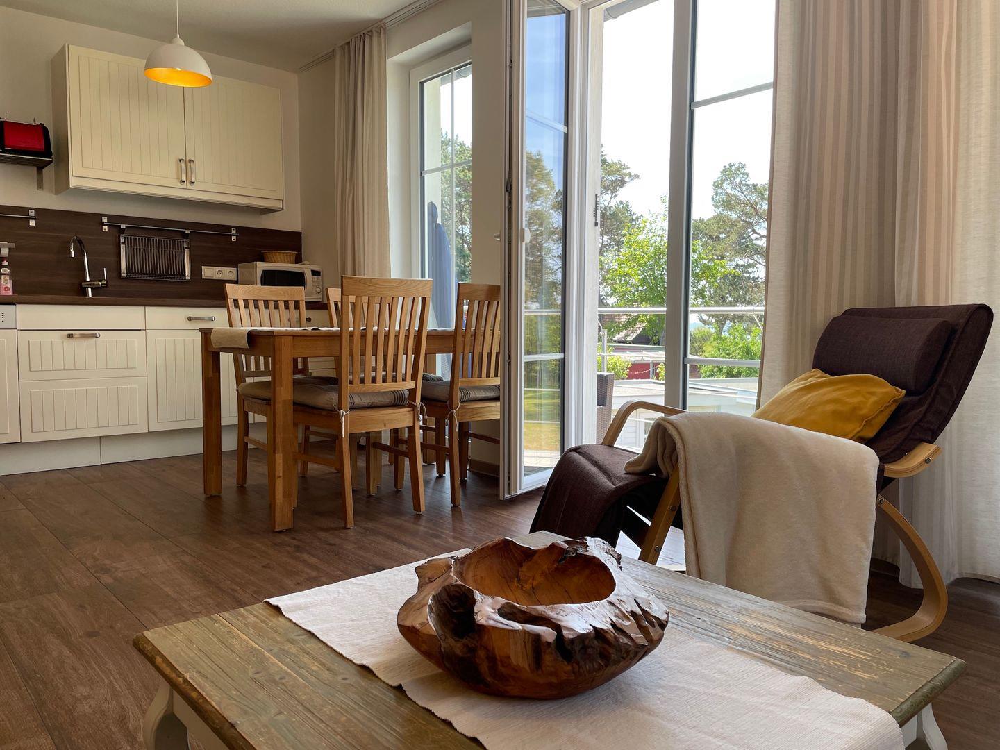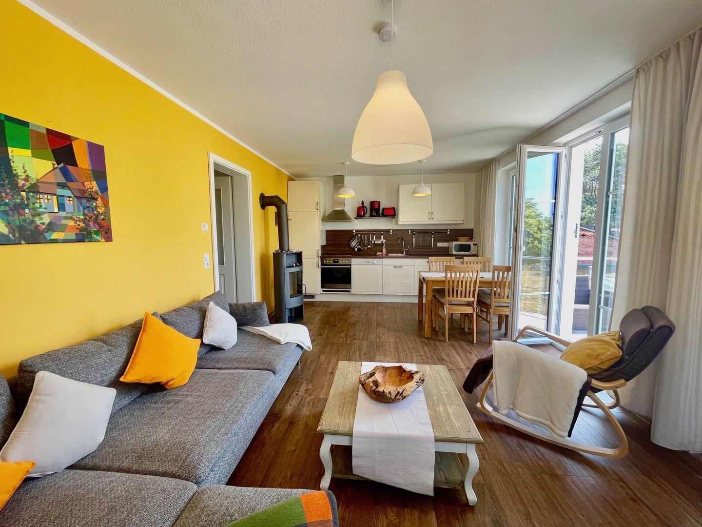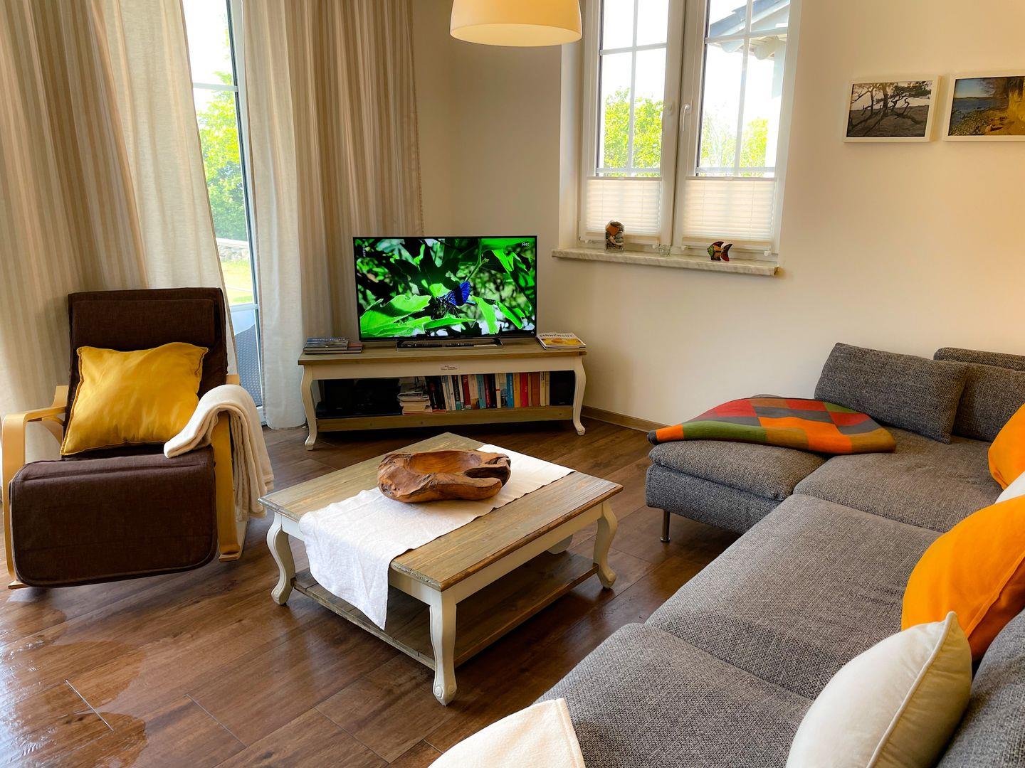 Die komfortable Nichtraucherwohnung für 2 bis 4 Personen befindet sich im Obergeschoß und hat ca. 55qm. Der helle offene Wohn- und Essbereich ist mit rustikalen Massivholzmöbeln im nordischen Stil eingerichtet und hat eine durchgängige Fensterfront Richtung Süden mit Blick auf die Ostsee und den großen Garten. Auf der bequemen Eckcouch mit Couchtisch und Sideboard mit modernen LED-Full-HD Flachbildschirm, CD-Player und Blu-ray-Player können Sie gemütliche Abende mit der Familie verbringen. Für die romantische Wärme sorgt in den kühlen Tagen ein Holzkamin.