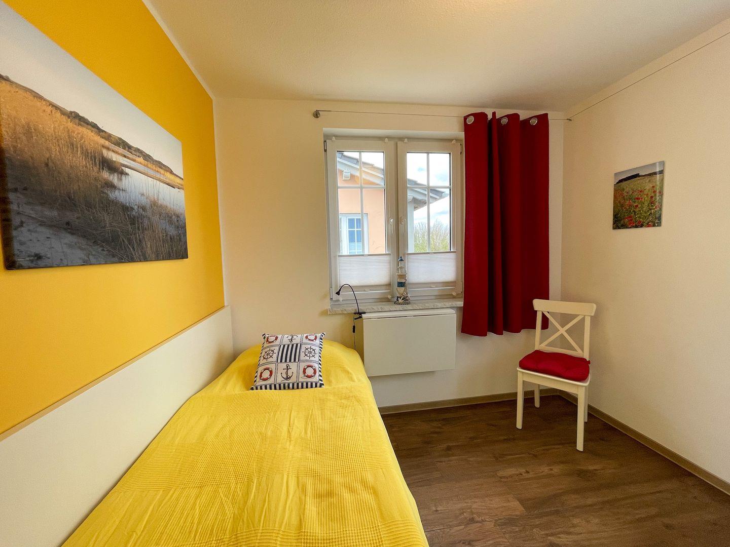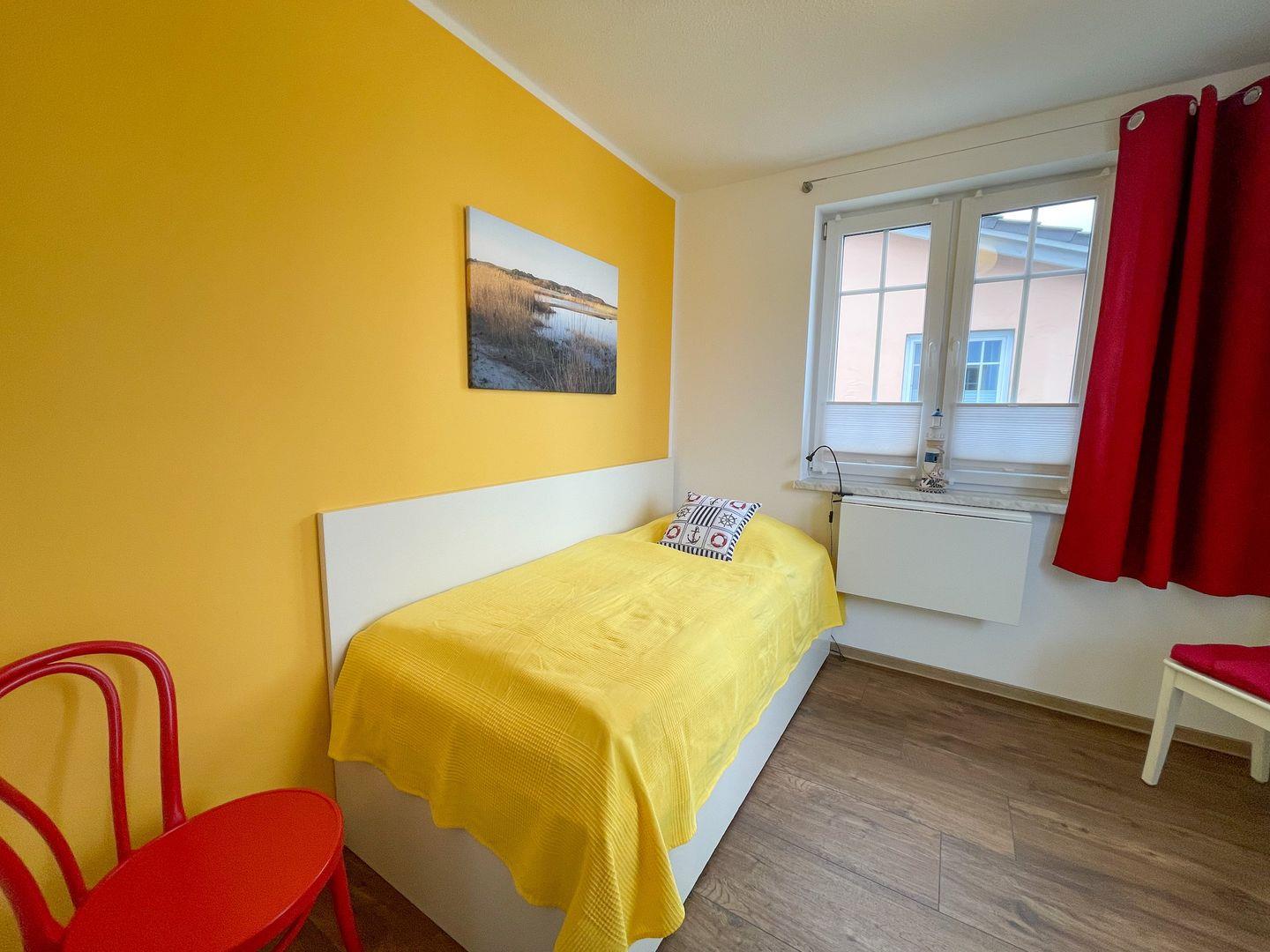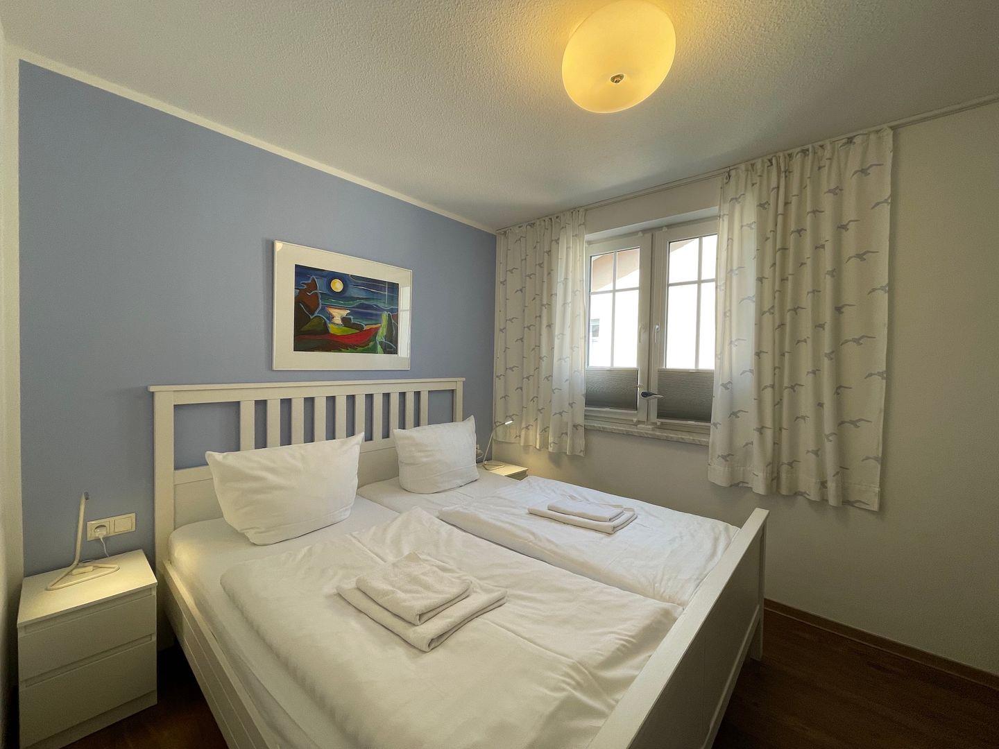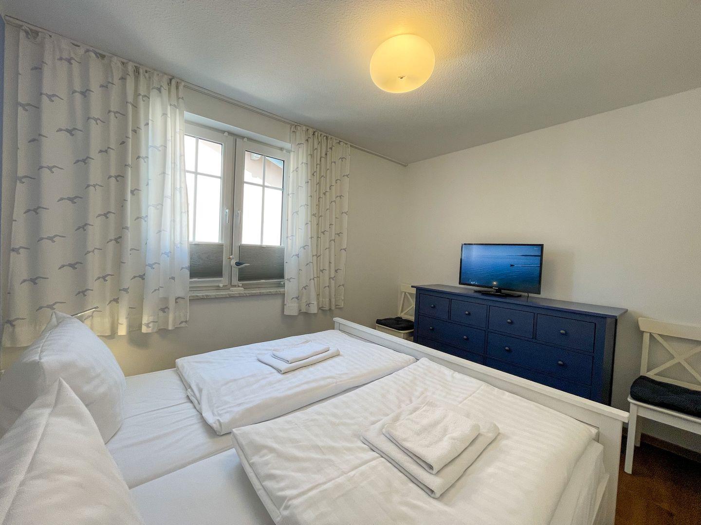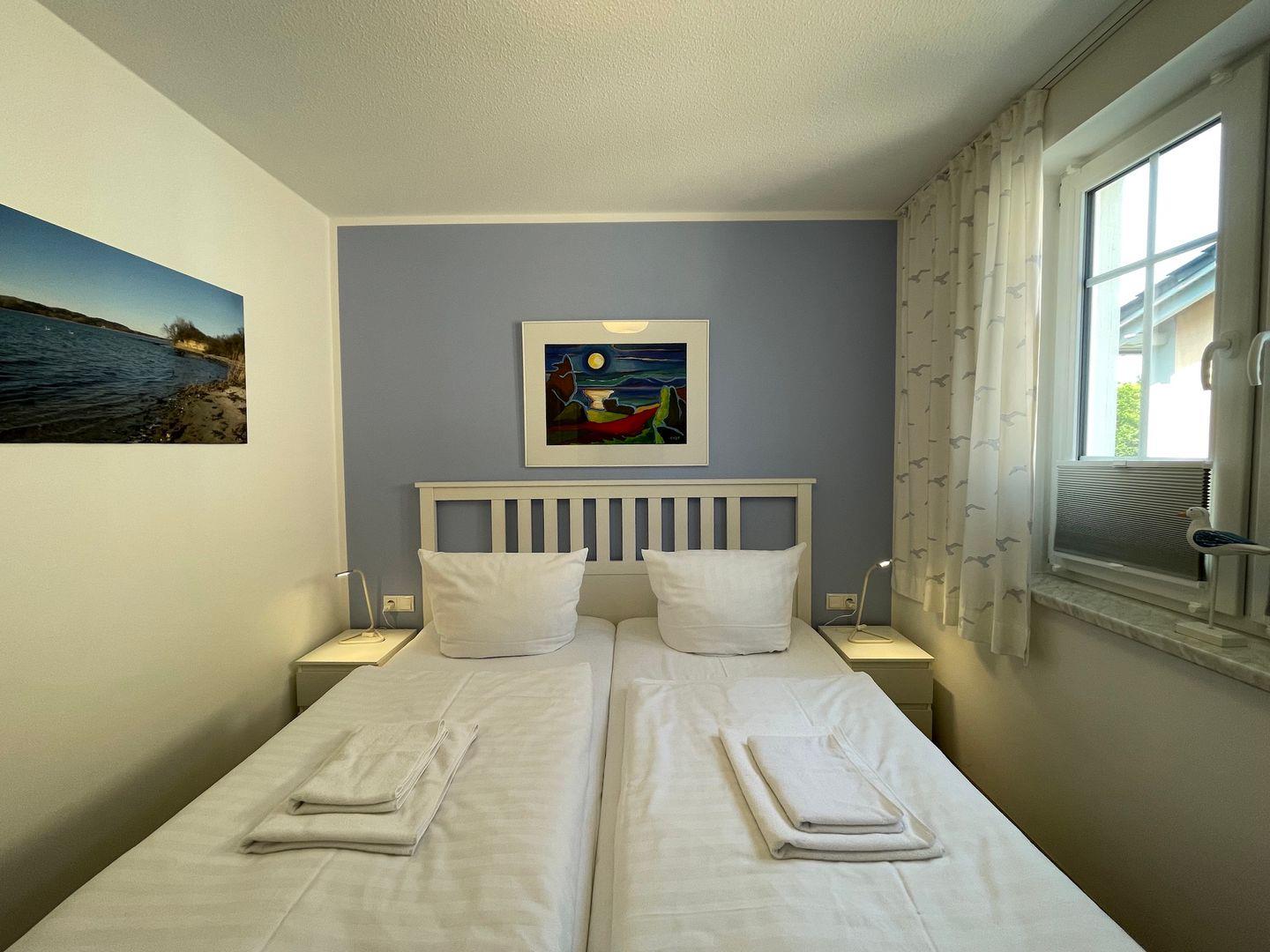 Das Schlafzimmer mit Doppelbett (1,80 m x 2,00 m) mit 7-Zonen-Kaltschaummatratzen H2/H3), 2 Nachttischen und großer Kommode ist hell und geschmackvoll eingerichtet. 2. Schlafzimmer hat ein Kojenbett mit Ausziehfunktion (2 x 0,80 m x 2,00 m), einen kleinen Schrank. Beide Schlafzimmer sind mit Verdunklungsplissees ausgestattet.
