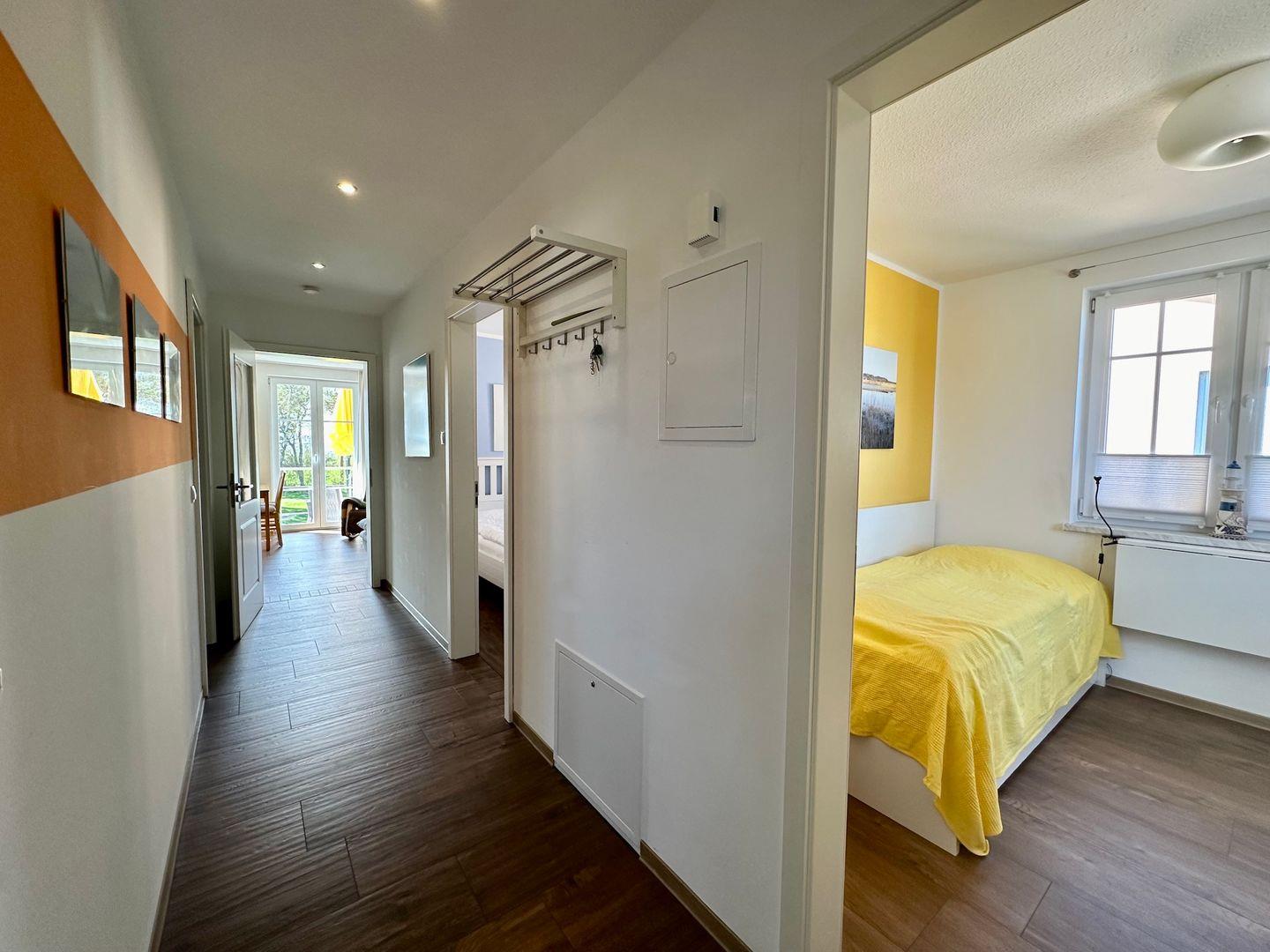 Im Dielenbereich befindet sich Garderobe und Kleiderschrank mit Spiegel.