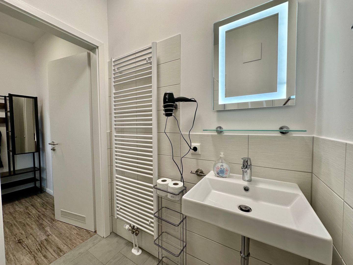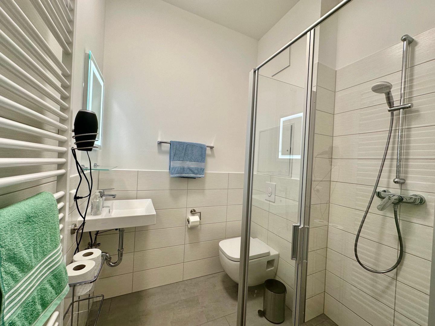 Die ebenerdige Dusche im Bad sorgt für viel Bequemlichkeit. WC, Waschtisch, Regal, Fön und ein großes Spiegel ergänzen die Ausstattung.