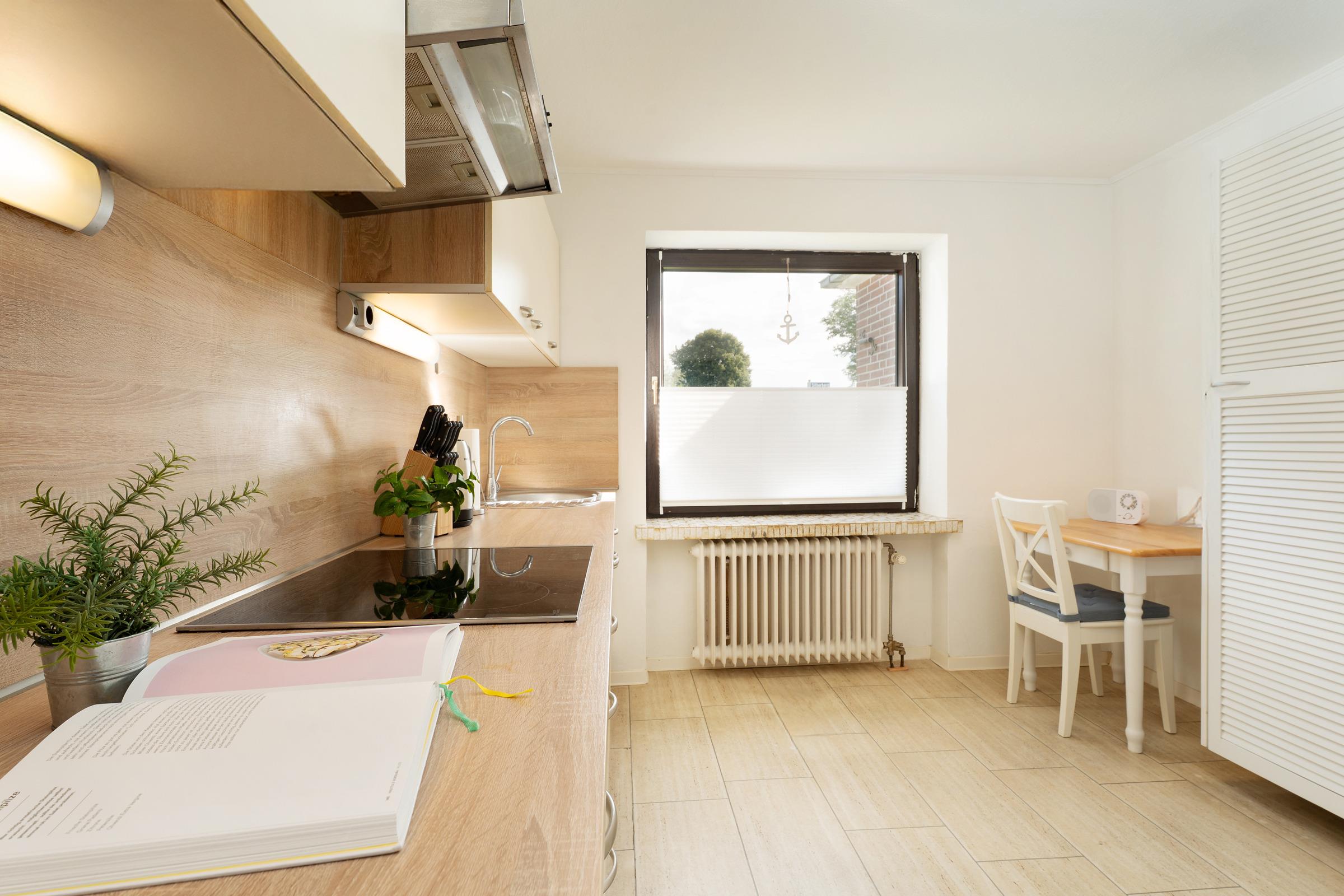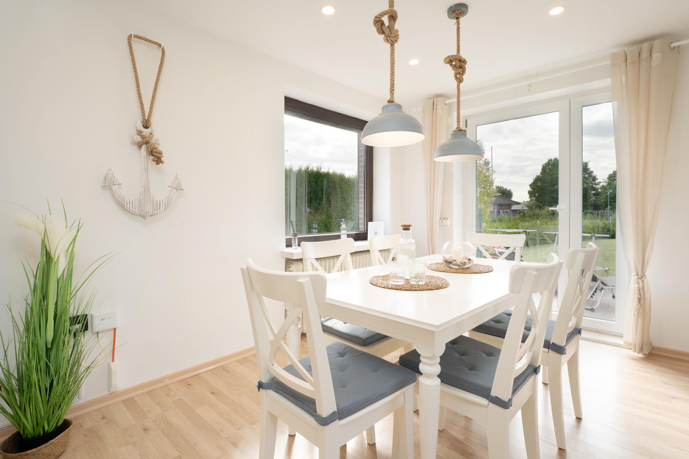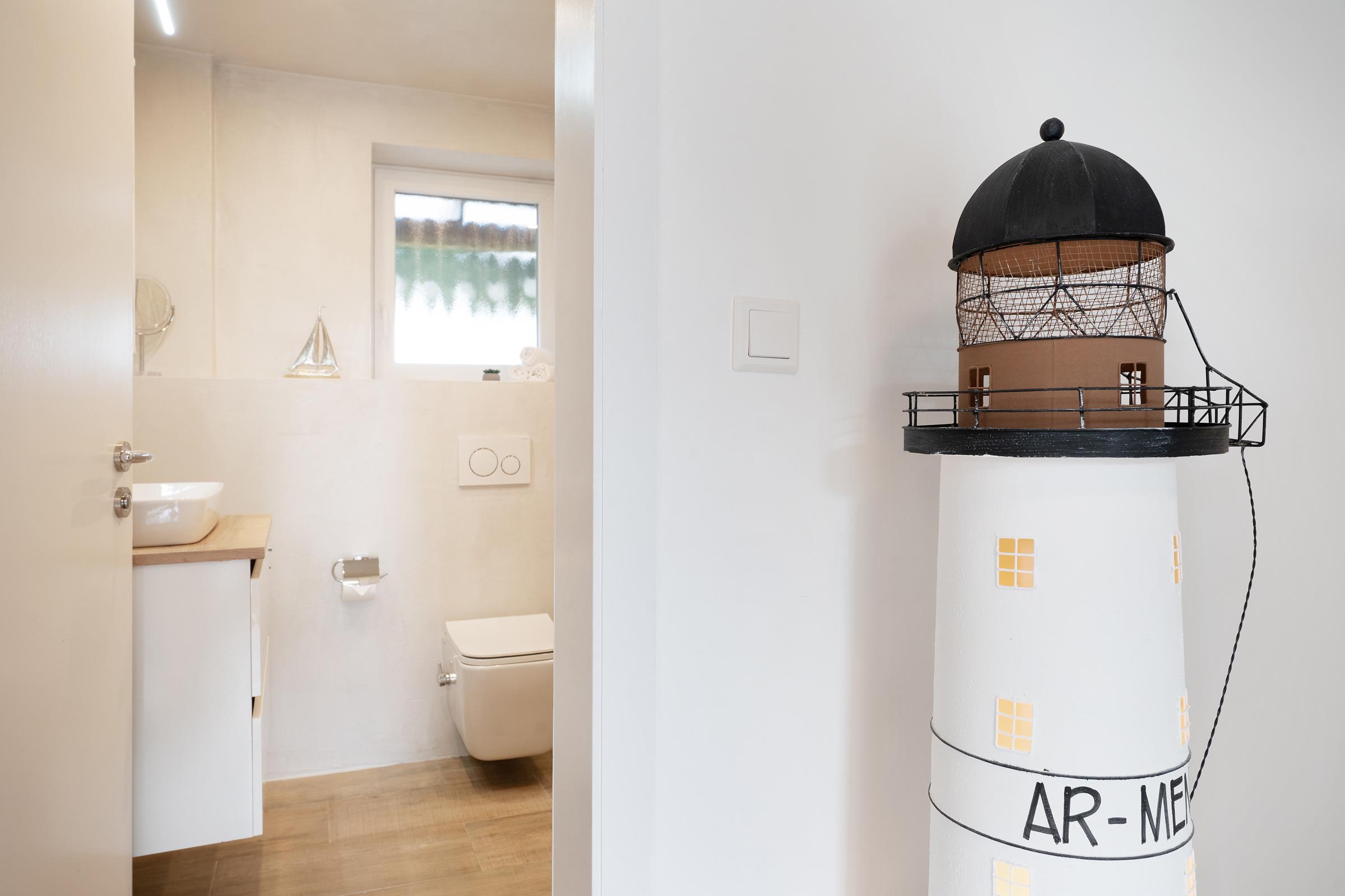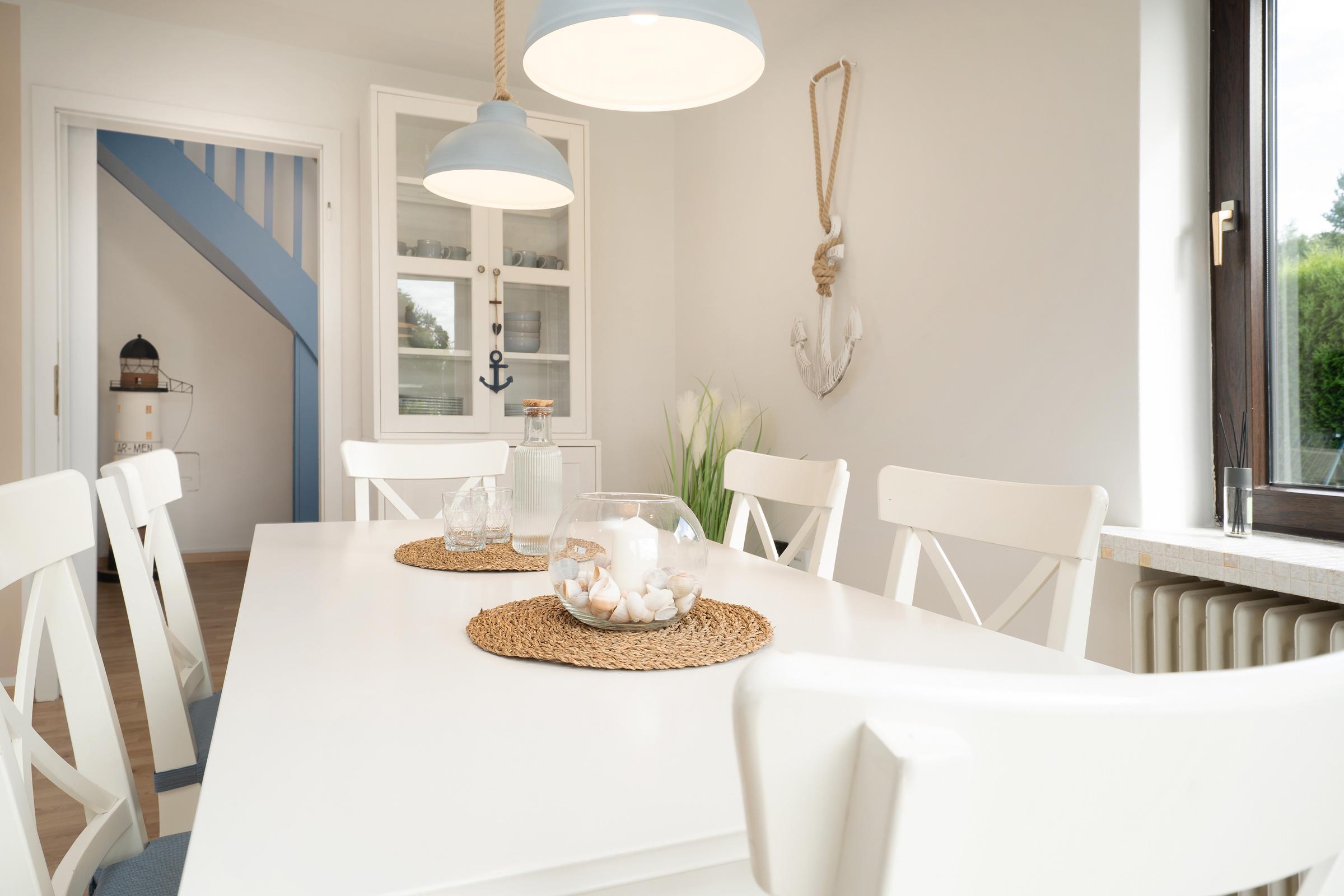 Die Küche bietet alles, was Sie zum Kochen benötigen: Backofen, Ceran-Kochfeld, Kaffeemaschine (auch eine Senseo-Kapselmaschine), Toaster, Wasserkocher, Mikrowelle und Geschirrspüler. Der angrenzende Essbereich ist praktisch und gemütlich gestaltet. Die beiden Schlafzimmer sind mit gemütlichen Doppelbetten ausgestattet. Das Bad im Erdgeschoss verfügt über eine bodengleiche Dusche, Badewanne, WC und Bidet. Das Badezimmer im Obergeschoss bietet eine weitere Duschmöglichkeit. Für unsere kleinen Gäste stehen ein Kinderreisebett und ein Hochstuhl bereit.