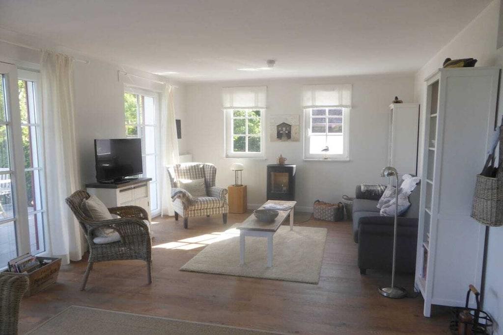 Parterre: (Küche(, Kochplatte, Backofen, Spülmaschine, Kühlschrank, Tiefkühlschrank, Fliegenfenster), Wohn/Esszimmer(, , Bibliothek, TV, Esstisch, Herd, Fliegenfenster), Schlafzimmer(, Einzelbett, Einzelbett, Fliegenfenster), Badezimmer(, Toilette, Dusche, Waschbecken, Heizung)) In der 1. Etage: (Wohnzimmer(, , Bibliothek, TV, Fliegenfenster), Schlafzimmer(, Doppelbett, Fliegenfenster), Badezimmer(, Toilette, Badewanne, Dusche, Waschbecken, Waschmaschine, Heizung, Föhn)) , , , Schlafzimmer(, Einzelbett, Einzelbett, Fliegenfenster), Internet, Trockner, Waschmaschine, Balkon, Heizung, Terrasse(, Zentraler Grill, Strand, Grill, Grill, Gartenmöbel, Liegen), Garten(Zentraler Grill, Liegewiese, Gartenmöbel, Liegen, Gartenhaus), Parkplatz, Fahrräder verfügbar, Bügelbrett, Bügeleisen, Trockenschrank, Wäschepaket gegen Gebühr