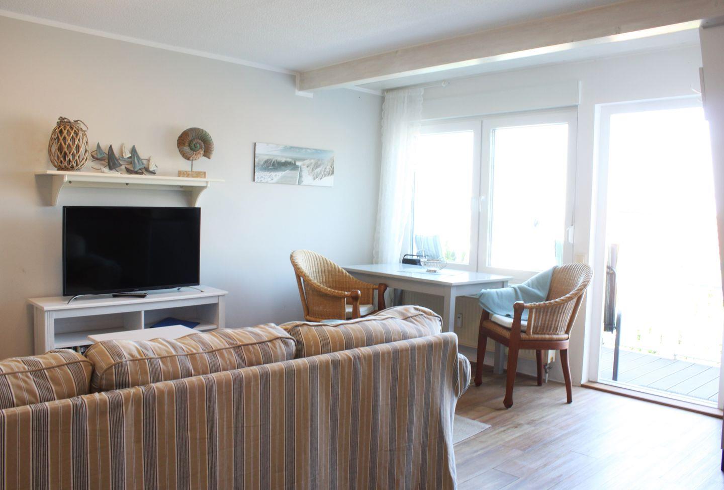 Ein heller Wohn- und Essbereich mit gemütlicher Sofaecke, TV-Gerät, Wlan und Esstisch lädt zu entspannten Stunden ein. Hier befindet sich auch der Zugang zum möblierten Balkon, von dem aus Sie einen traumhaften Blick auf die Ostsee und den Hafen von Timmendorf haben.