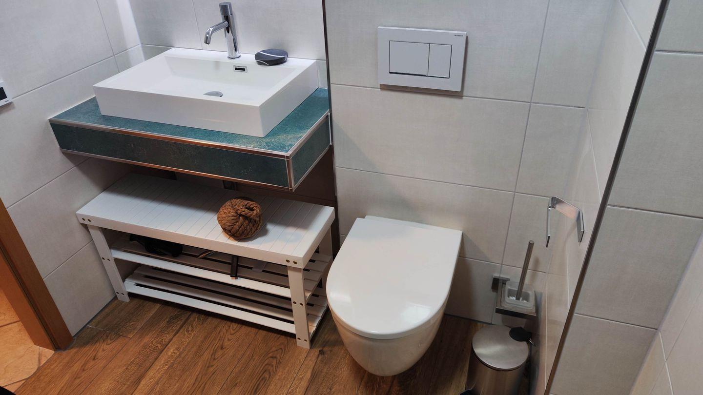 Das gemütliche Schlafzimmer ist mit einem Doppelbett und Stauraum für Ihre Garderobe eingerichtet. Im modernen, maritimen Badezimmer verfügen Sie über eine Dusche, einen Waschtisch, ein WC und einen Föhn und haben somit alles für einen angenehmen Start in den Tag.