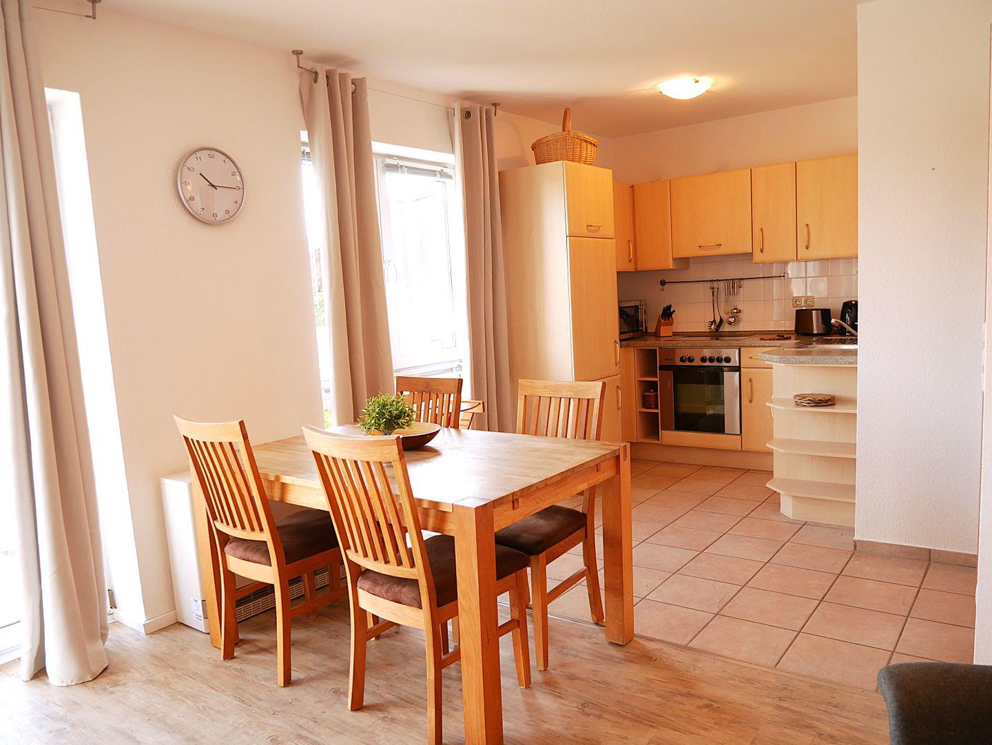 Die offene Küche ist vollständig ausgestattet und lässt keine Wünsche offen. Sie finden hier einen Herd, eine Mikrowelle, einen Kühlschrank mit Gefrierfach und eine Kaffeemaschine. Für den kleinen Hunger zwischendurch stehen ein Toaster, ein Mixer und ein Wasserkocher bereit.