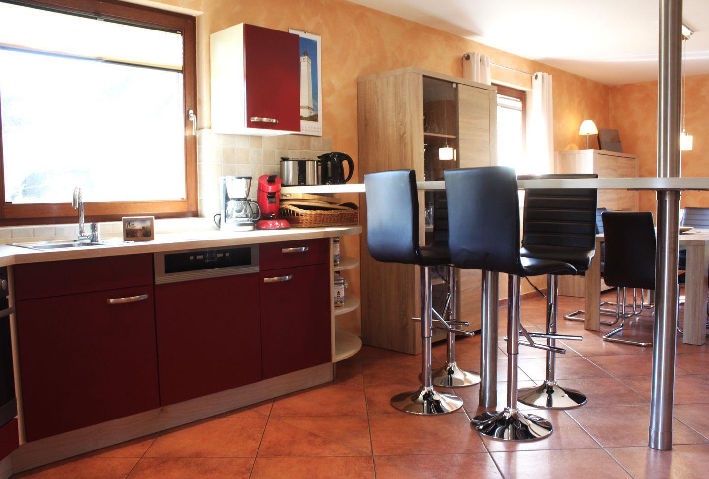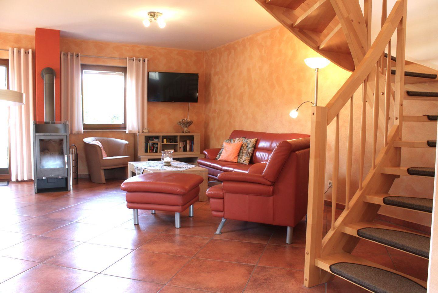 Im Erdgeschoss erwartet Sie ein großzügiger Wohnraum mit Kaminofen, Sitzecke und großem Esstisch, abgetrennt durch einen Tresen mit Barhockern von der vollausgestatteten offenen Küche.