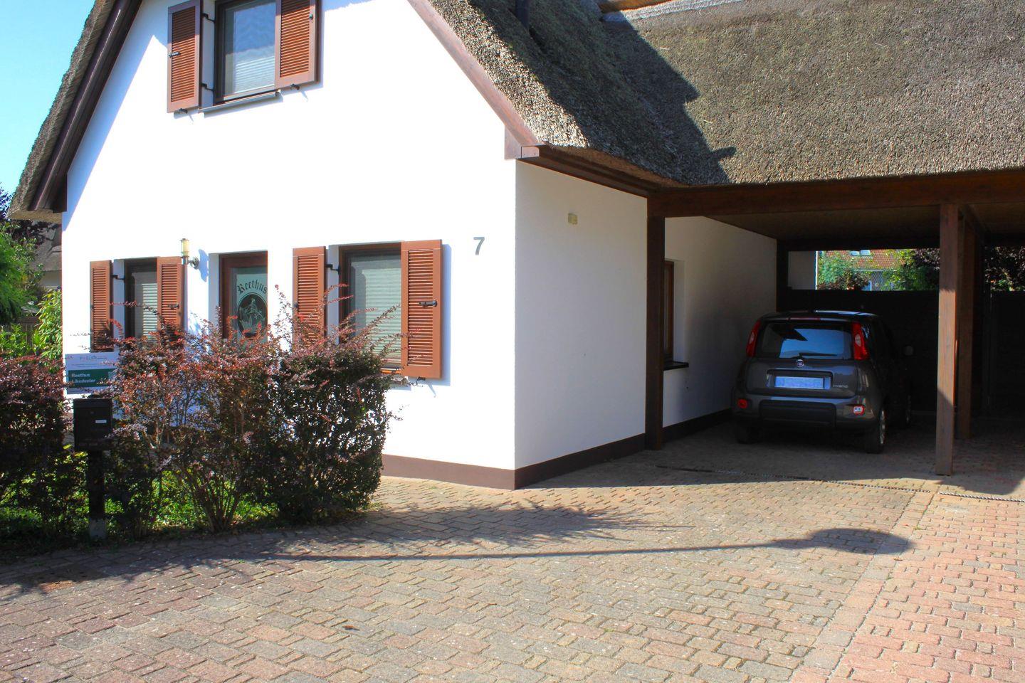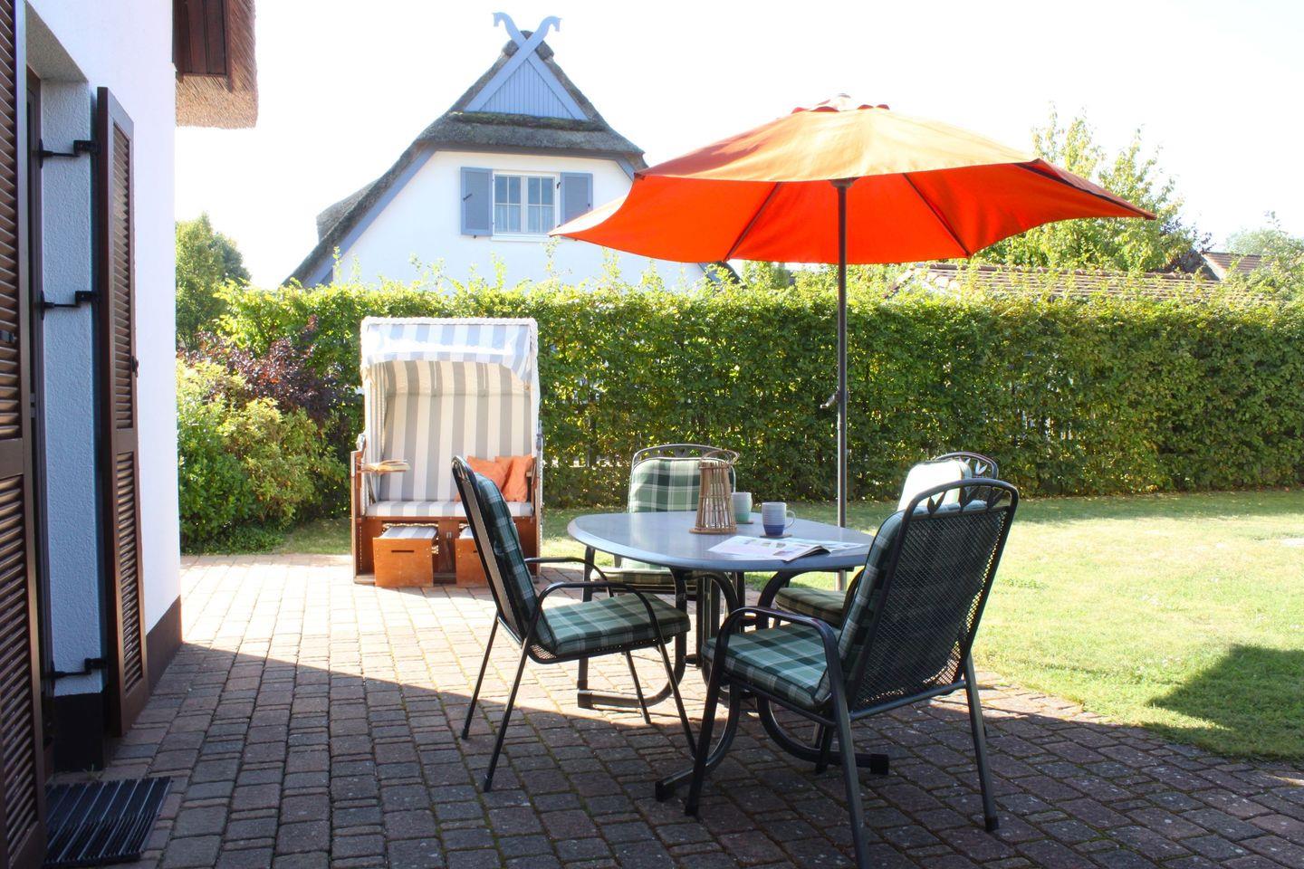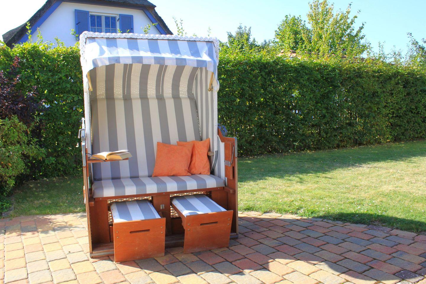 Zum Haus gehört eine große Terrasse mit Gartenmöbeln, Strandkorb und Grill, sowie ein großer Garten. Auf dem Grundstück befinden sich ein Carport und ein weiterer großer Parkplatz.