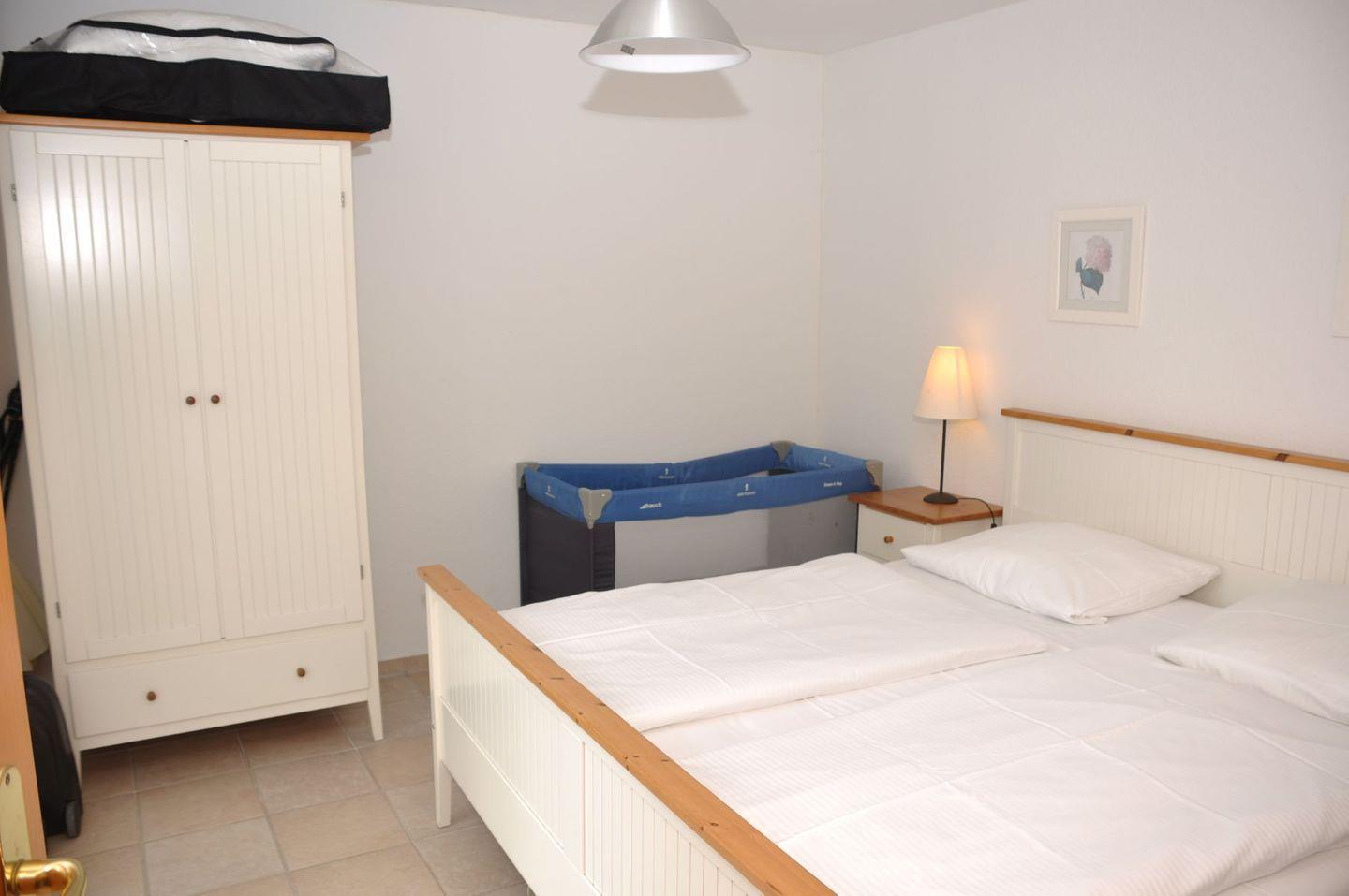 Über eine Treppe erreichen Sie die obere Etage der Wohnung. Hier befindet sich das zweite Schlafzimmer mit zwei Einzelbetten und Stauraum für Ihre Garderobe. Ein kleiner französischer Balkon bietet einen schönen Blick auf das Meer, den Hafen und den Leuchtturm von Timmendorf und rundet die Ausstattung der Wohnung ab.