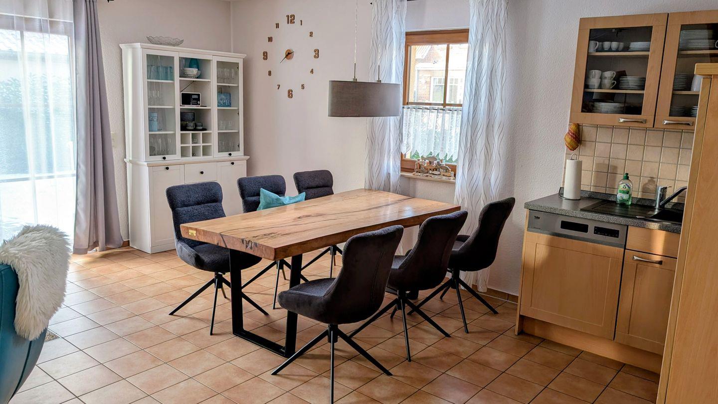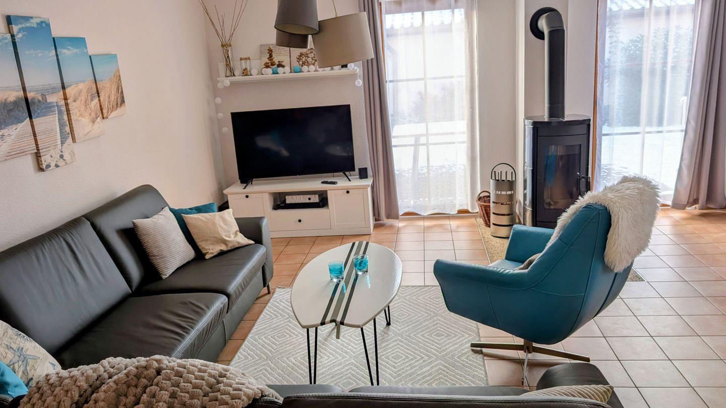 Ein heller, moderner Wohn- und Essbereich lädt mit seiner gemütlichen Sofaecke, dem TV-Gerät, einem Kamin, ein DVD-Player und Wlan zu entspannten Stunden ein. Die zusätzliche Fußbodenheizung sorgt für ein angenehmes Raumklima und Wohlfühlatmosphäre.