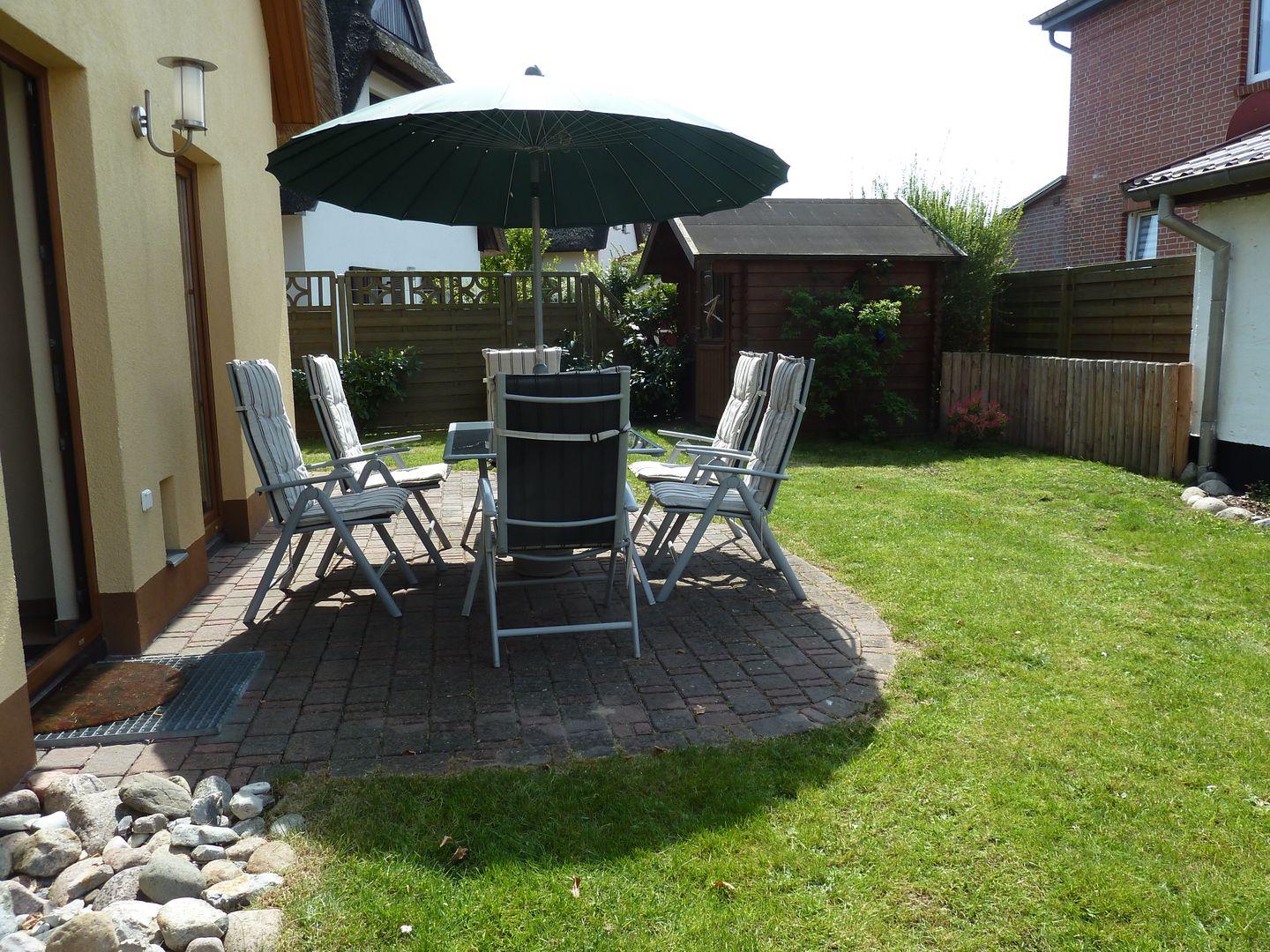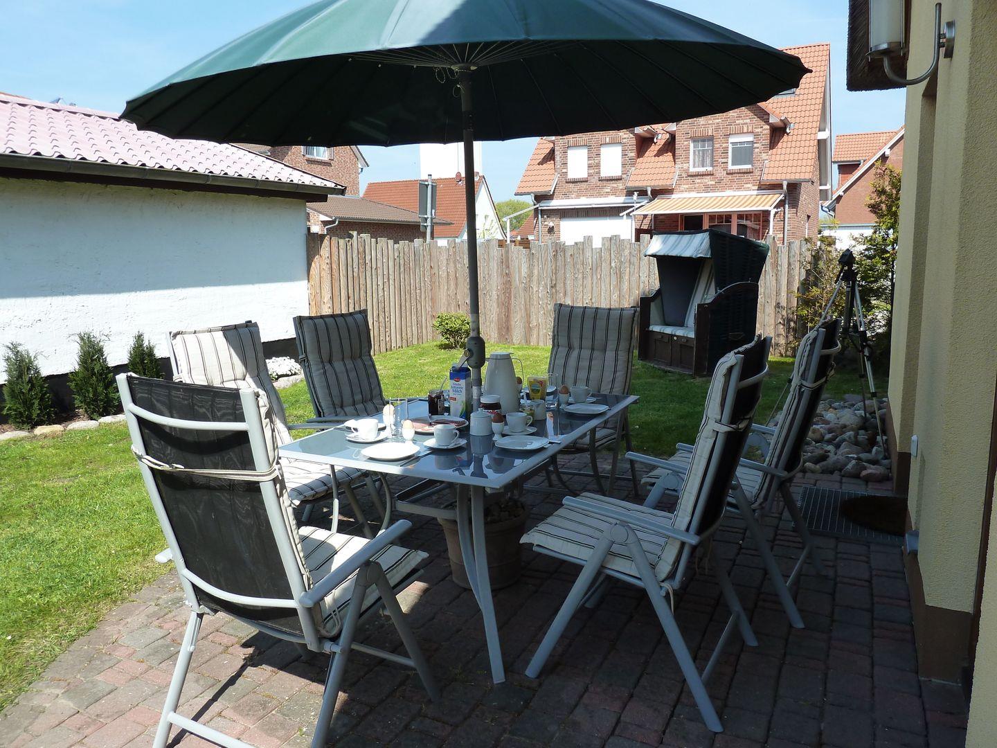 Auf der möblierten Terrasse mit Strandkorb können Sie Relaxen, die Seele baumeln lassen und den Blick in den Garten genießen. Auch Ihr vierbeiniger Liebling findet hier genügend Platz sich auszutoben.