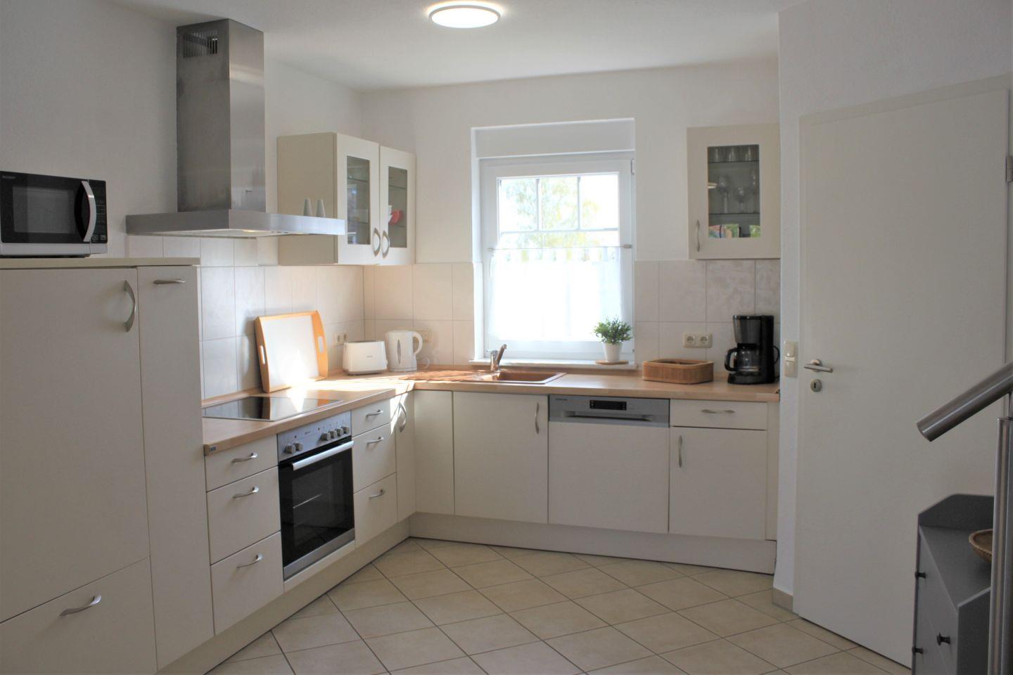 Die Küche ist in den Raum integriert und überzeugt mit einer modernen und vollwertigen Ausstattung. Ein Kühlschrank mit Gefrierfach, ein Herd mit Backofen, eine Geschirrspülmaschine, eine Mikrowelle sowie Kaffeemaschine, Wasserkocher und vieles mehr sorgen für beste Voraussetzungen für eine selbstständige Versorgung.