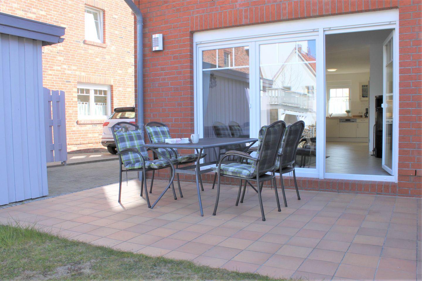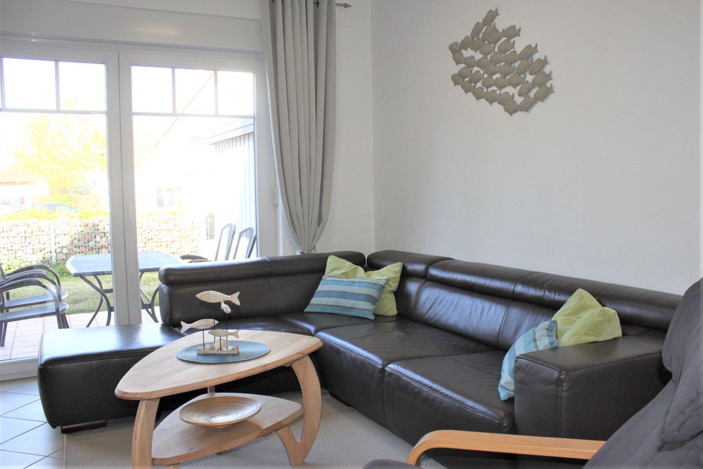 Ein heller kombinierter Wohn- und Essbereich lädt mit seiner großzügigen Sofalandschaft, dem TV-Gerät, WLAN, dem Kamin und dem Esstisch zu geselligen Stunden ein. Außerdem befindet sich hier der Zugang zur möblierten Terrasse mit Grill, auf der Sie entspannte Stunden verbringen können.