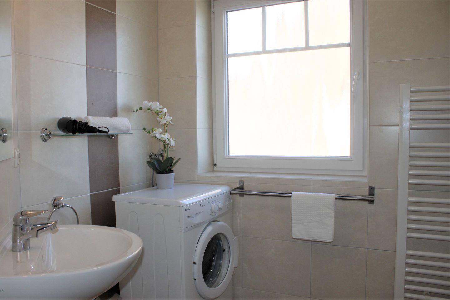 Des Weiteren befindet sich hier auch das zweite Badezimmer mit großzügiger Dusche, Waschtisch, Föhn, Waschmaschine und WC.